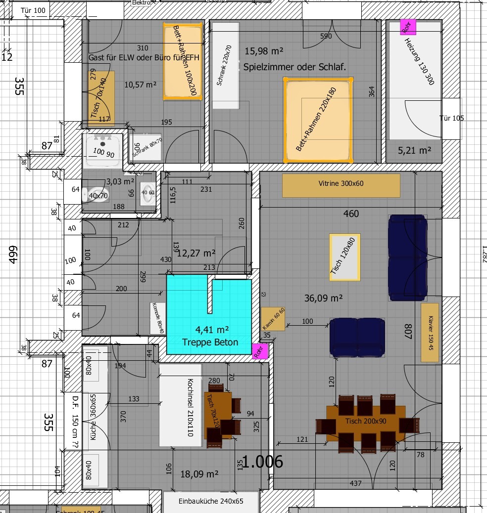 I honestly see nothing good, well thought out, or positively noteworthy in your draft. You quoted me, but unfortunately omitted the justified subordinate clause... could it be that you fundamentally cannot grasp the focus of a statement? I mean, you bumble through your ideas, ask us for our opinion, but the focus of each statement seems to drift into nothingness with you. You ignore the statements. Instead, you discard a terrace in the granny flat, not only that: you take away any freedom of movement from the old gentlemen's seat, you forgo the desired sauna, a nice and functional entrance, and a nice staircase despite the horrendous square meters—someone should really open your eyes here. The twists and turns already indicate that the crux of the problem lies in the planning. It hasn't gotten better even after months, but a lousy draft is just tuned... not improved. Ugh, and always these explanations for a failed detail like "we also have that now, but are managing well with it"... compromises are sugarcoated or/and planning mistakes are repeated.