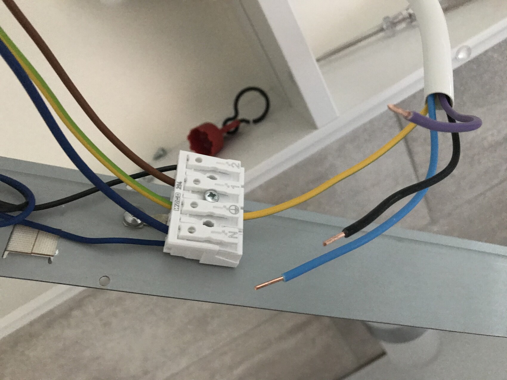 Tres colores estaban presentes en el espejo de baño y en los cables existentes, que fueron instalados correctamente por un electricista, y son del mismo color. Del lado de la casa, además del cable marrón, hay un cable gris que también muestra electricidad cuando lo mido. ¿Dónde debe conectarse este?