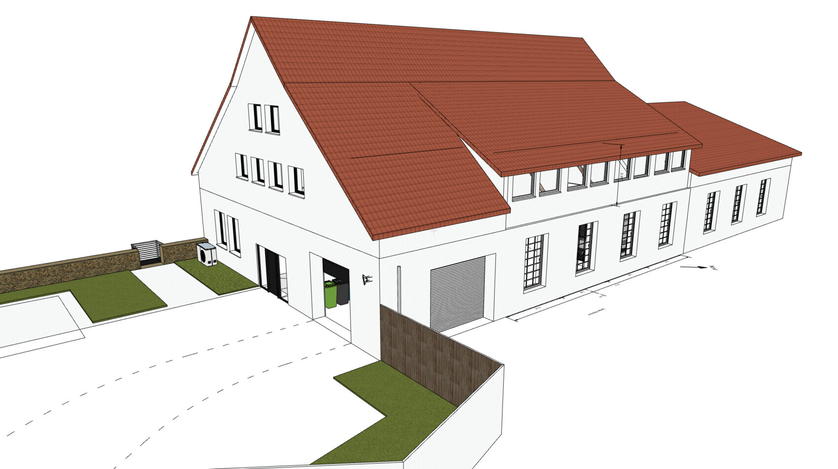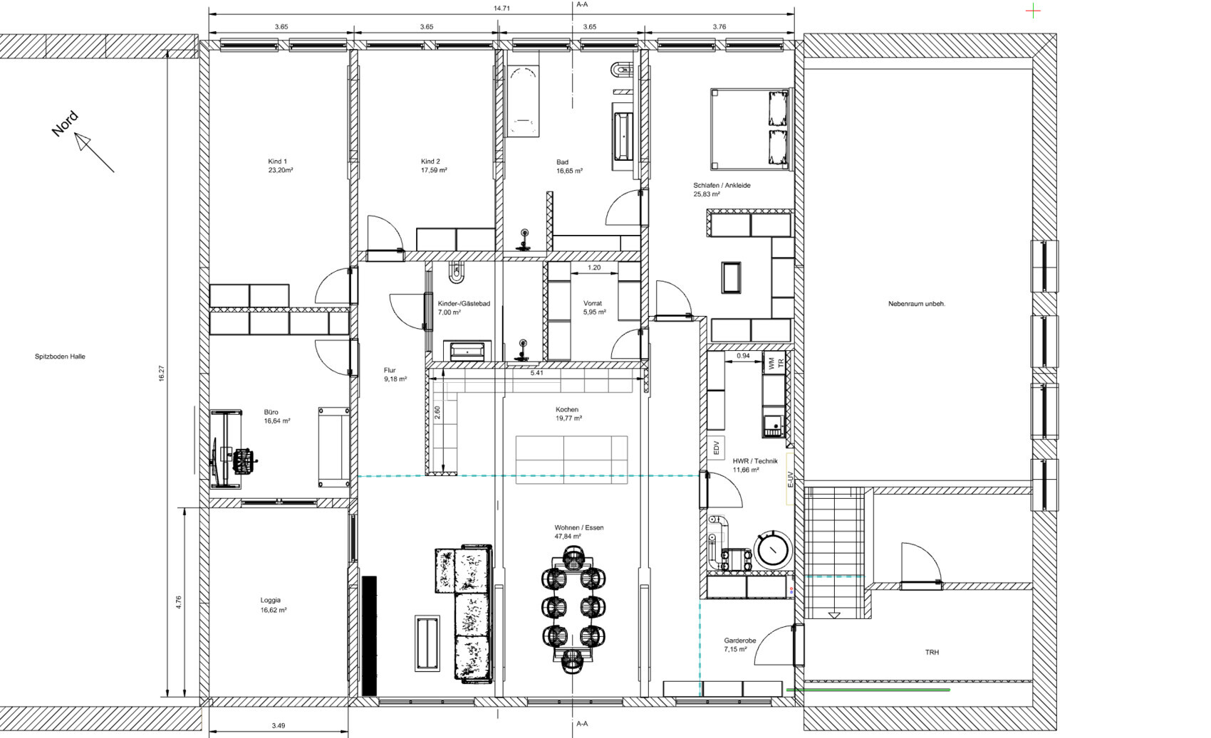 En este proyecto se trata de la posibilidad de convertir un pabellón/superficie de almacenamiento en espacio habitable. En la planta baja se encuentra la entrada y el "garaje", en la planta superior tenemos como una hoja en blanco con las medidas 14,6x16,2 m en la que podríamos dar rienda suelta a nuestra imaginación. La superficie es con más de 230 m² casi demasiado grande. La estructura del tejado en las paredes exteriores marca un poco la distribución de las habitaciones y ventanas. El reto de este proyecto es el cuerpo de edificio relativamente largo sin luz/ventanas en los laterales.