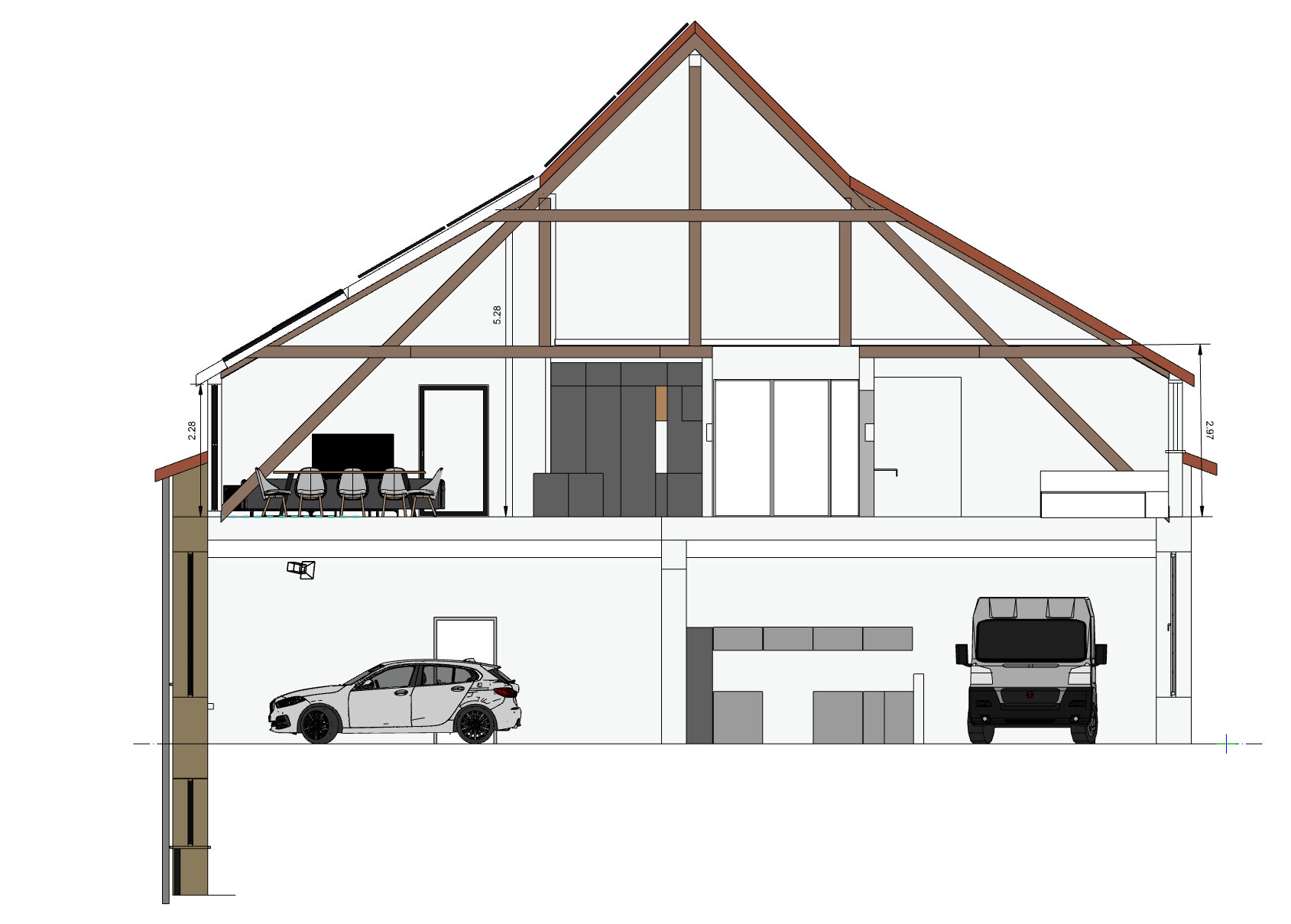 Área de estar abierta. Zona de dormir separada. Baño de los padres en el área de dormir de los padres. Baño de invitados cerca de las habitaciones infantiles (y oficina). Incluir la estructura del tejado como elemento estilístico. Techo del salón-comedor abierto hacia arriba. Deseo: El techo del resto de las habitaciones por encima de las vigas a aprox. +2,95 m cota superior del suelo acabado (vigas longitudinales visibles de la estructura del tejado).