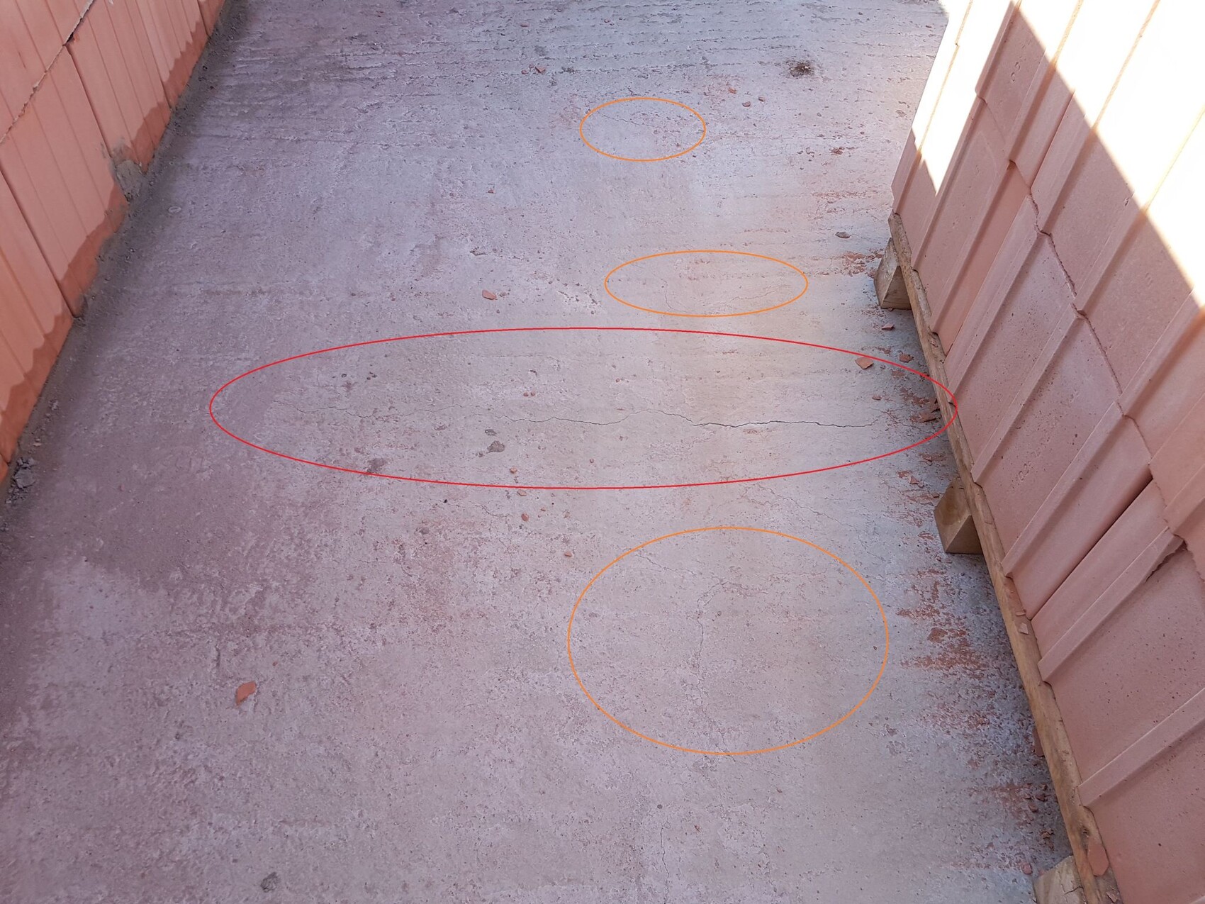 El viernes pasado se colocó el techo de la planta baja. Ayer (martes) me di cuenta de que en la cubierta se han formado muchas grietas pequeñas en toda la superficie (pequeñas tanto en longitud como en espesor). He fotografiado la más grande.
