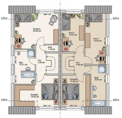Planta alta: lado derecho. Se deberían acomodar dos niños, el baño de unos 9 m² parece justo pero aceptable. Lo que podría molestarme aquí es que el baño es "en forma de tubo", ¿será molesto en la práctica? Lo segundo es que el dormitorio principal es muy pequeño, pero para eso los niños tienen espacio razonable. ¿Comentarios sobre el plano? Se tiene bastante libertad en la decisión, salvo por la escalera.
