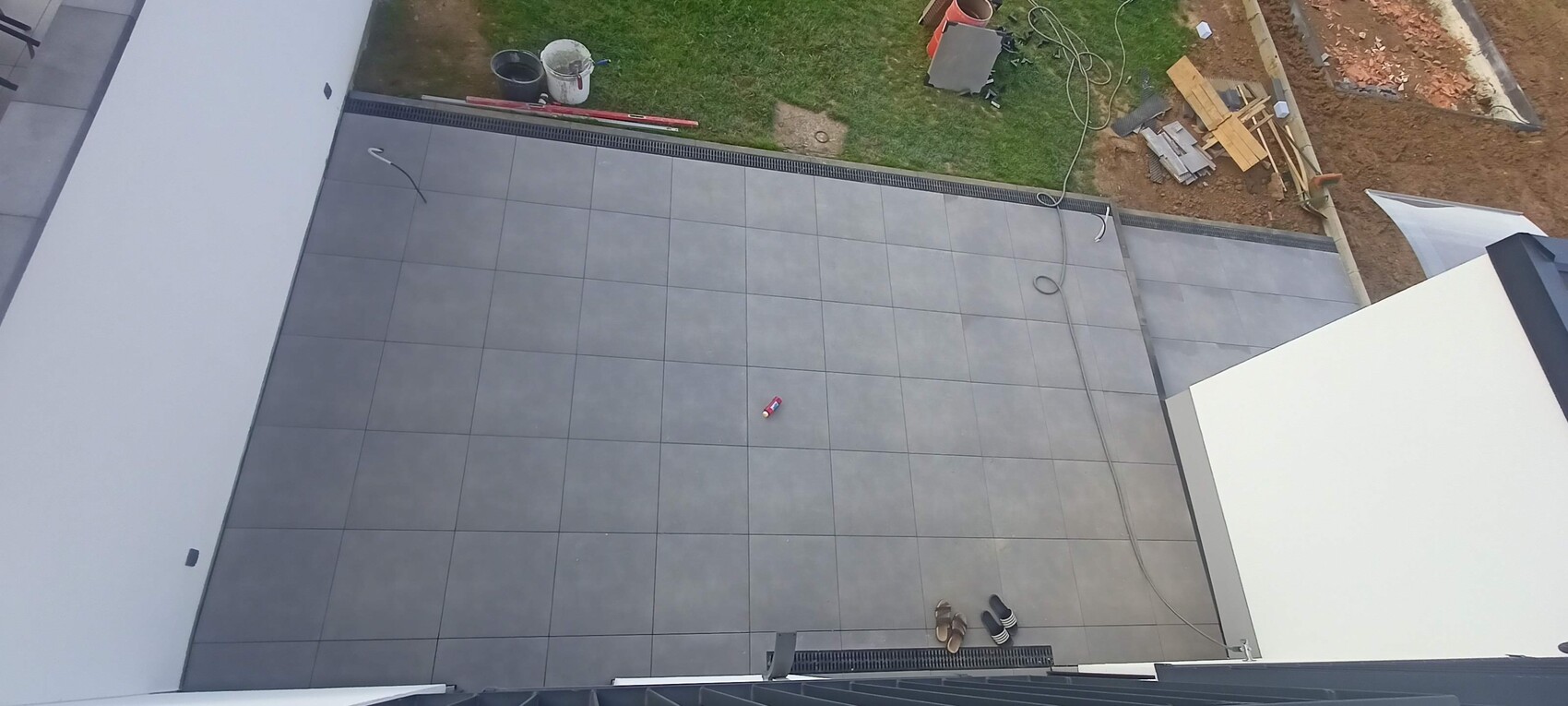 capa de carga de lava, concreto drenante, adhesivo para baldosas y placas de porcelanato de 2 cm.