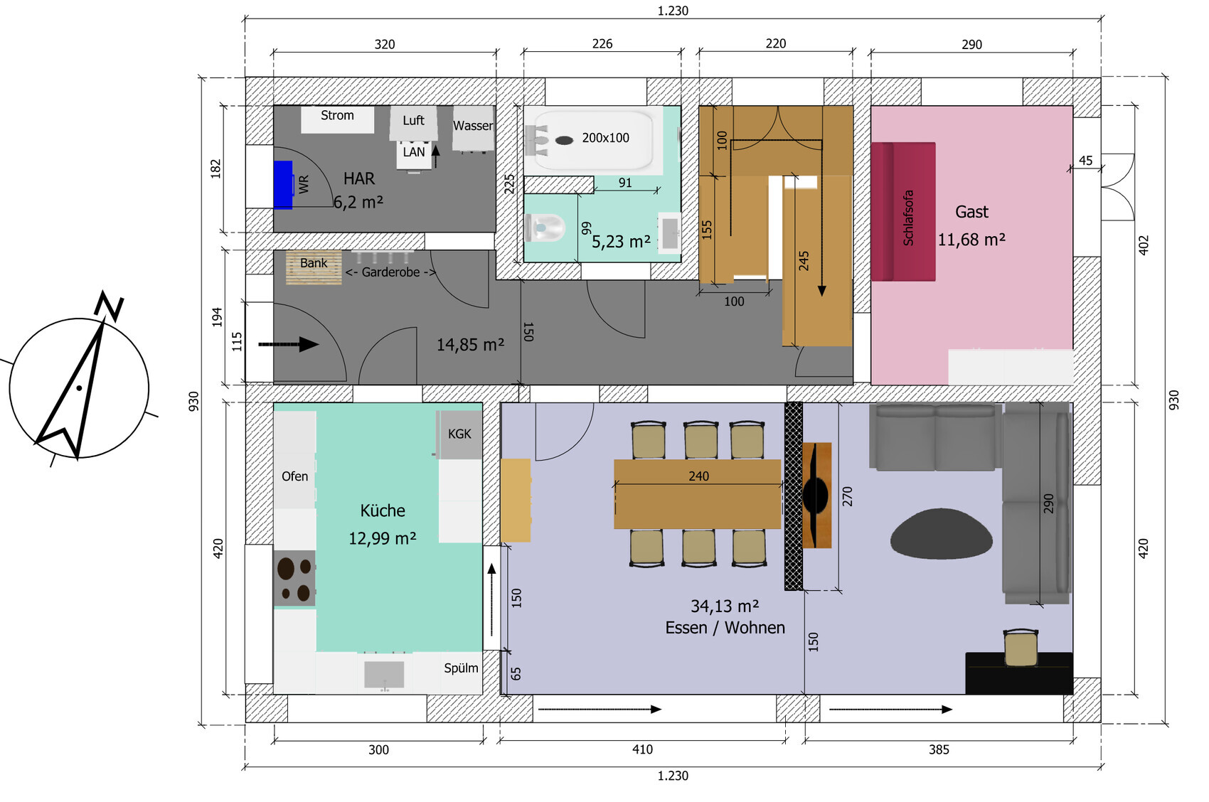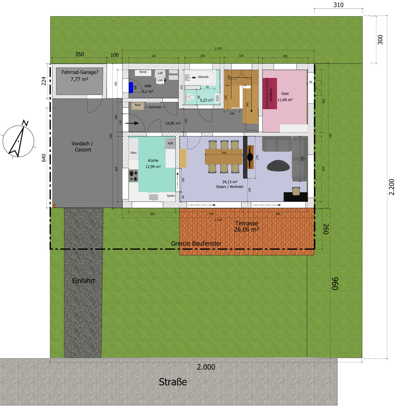 Las áreas exteriores, el carport y las ventanas no fueron planificados muy intensamente. Sobre el porche y el cobertizo no sé aún qué es posible y razonable. Así que se trata principalmente del interior.