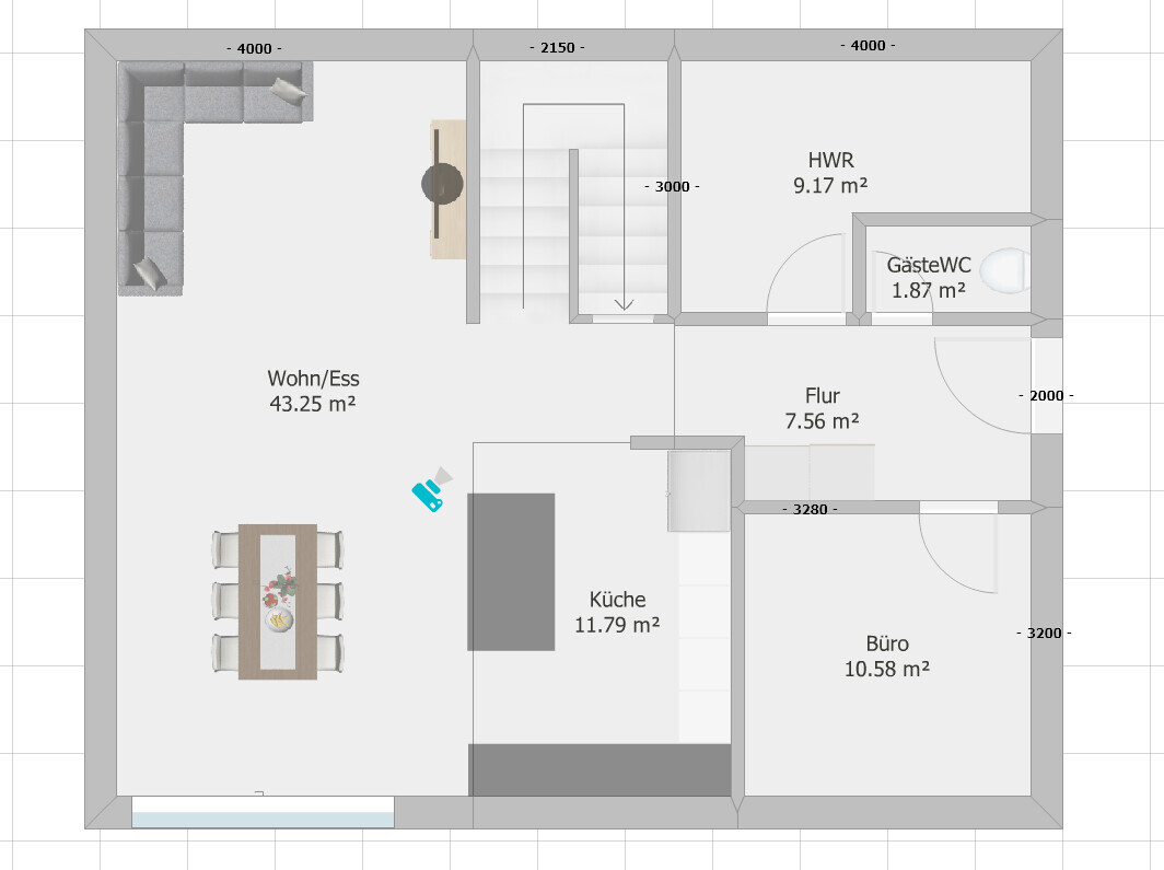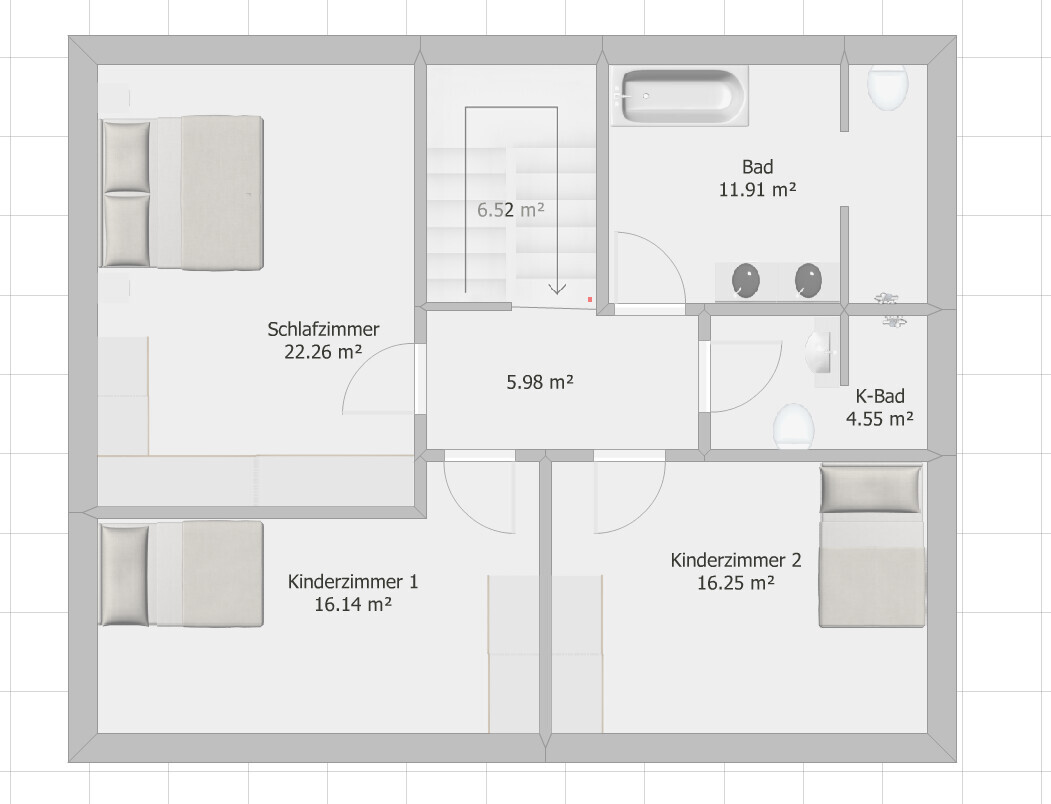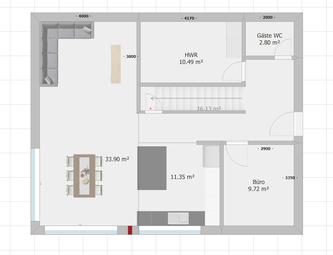 Wir wollten auf zwei Etagen unsere Wünsche einfließen lassen: EG: Büro, Abstellraum OG: Schlafzimmer, KZ, BAD.