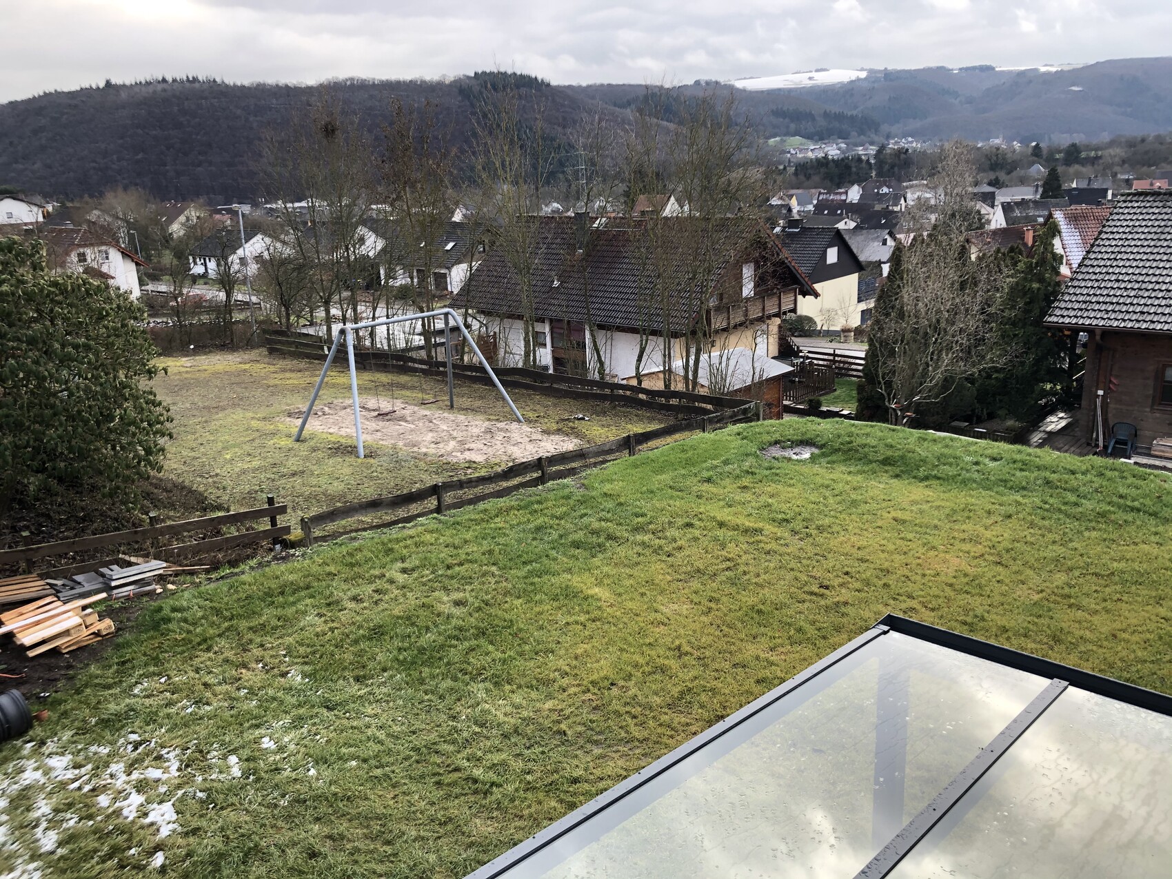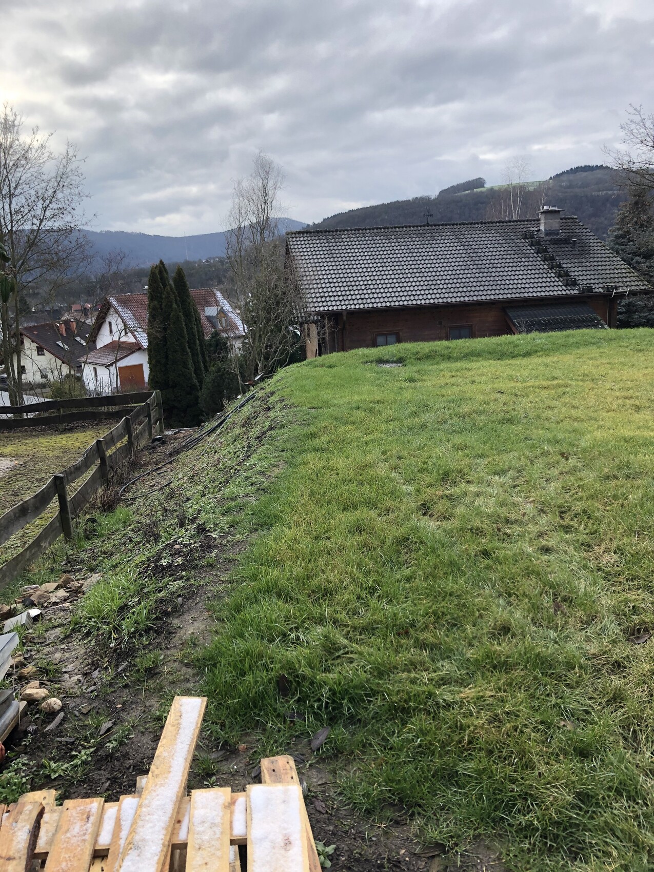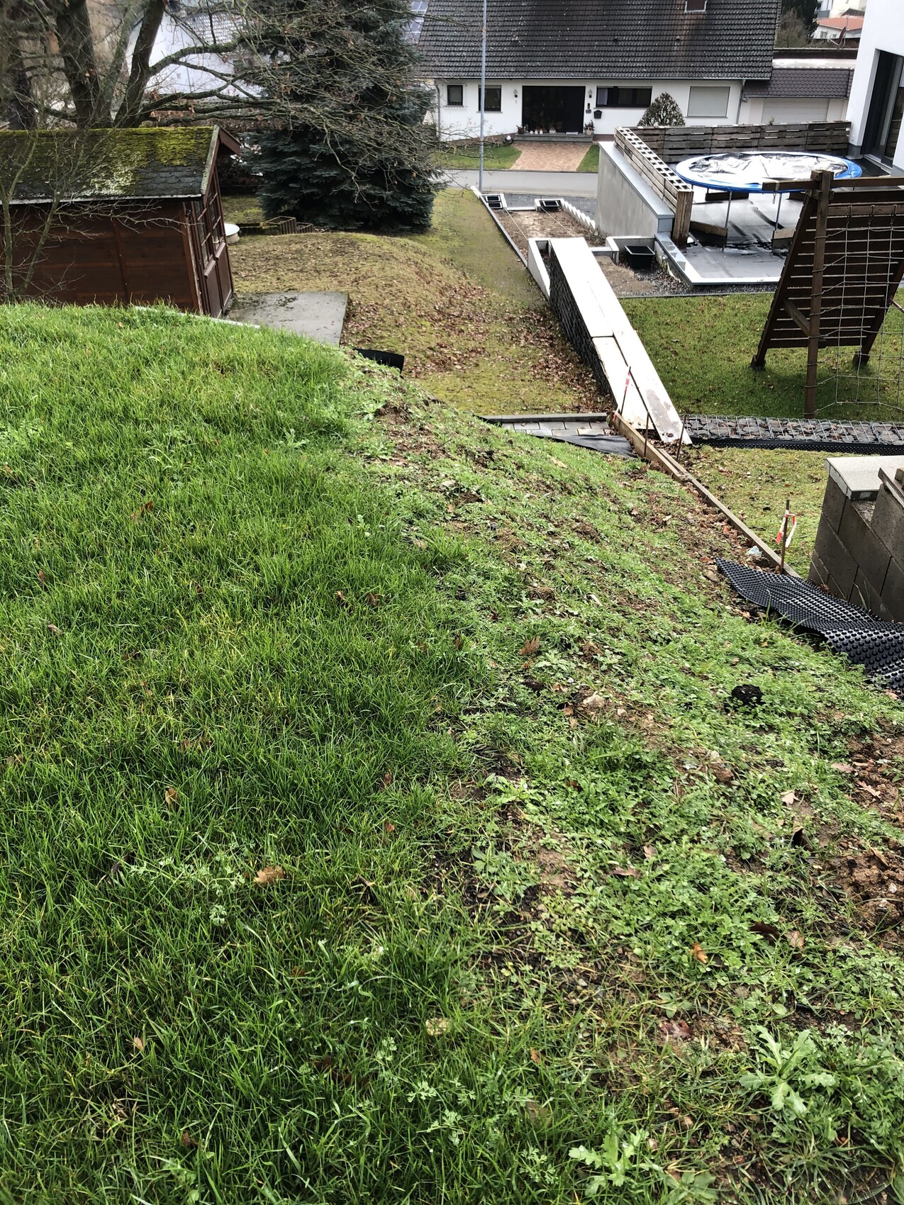 A la izquierda, donde también se ve un parque infantil, aún está muy inclinada. ¿Subiríais un muro y rellenaríais? En la esquina delantera definitivamente debería ir una caseta de jardín, ¿creéis que es posible hacer una base allí cerca del borde de la ladera?