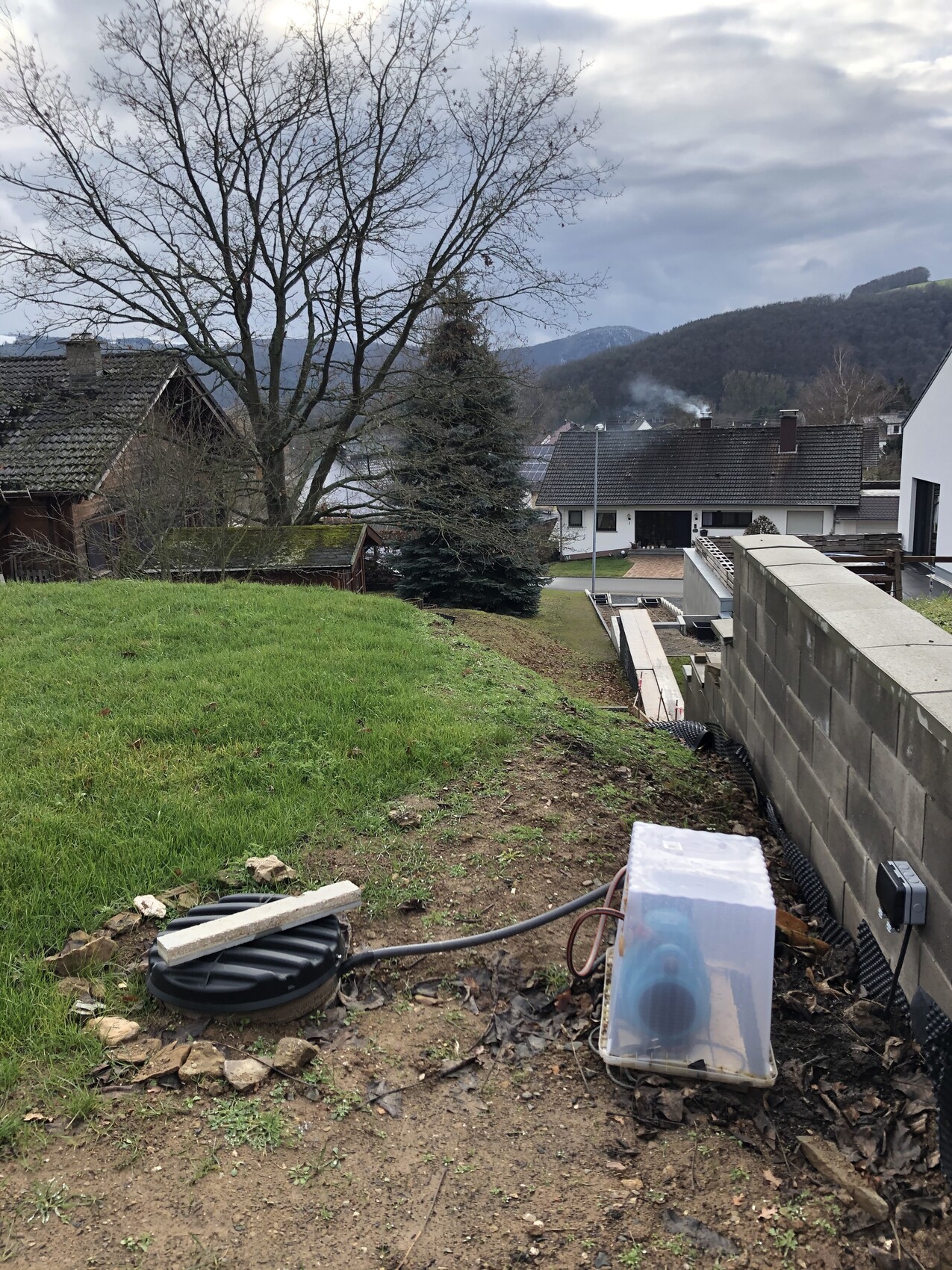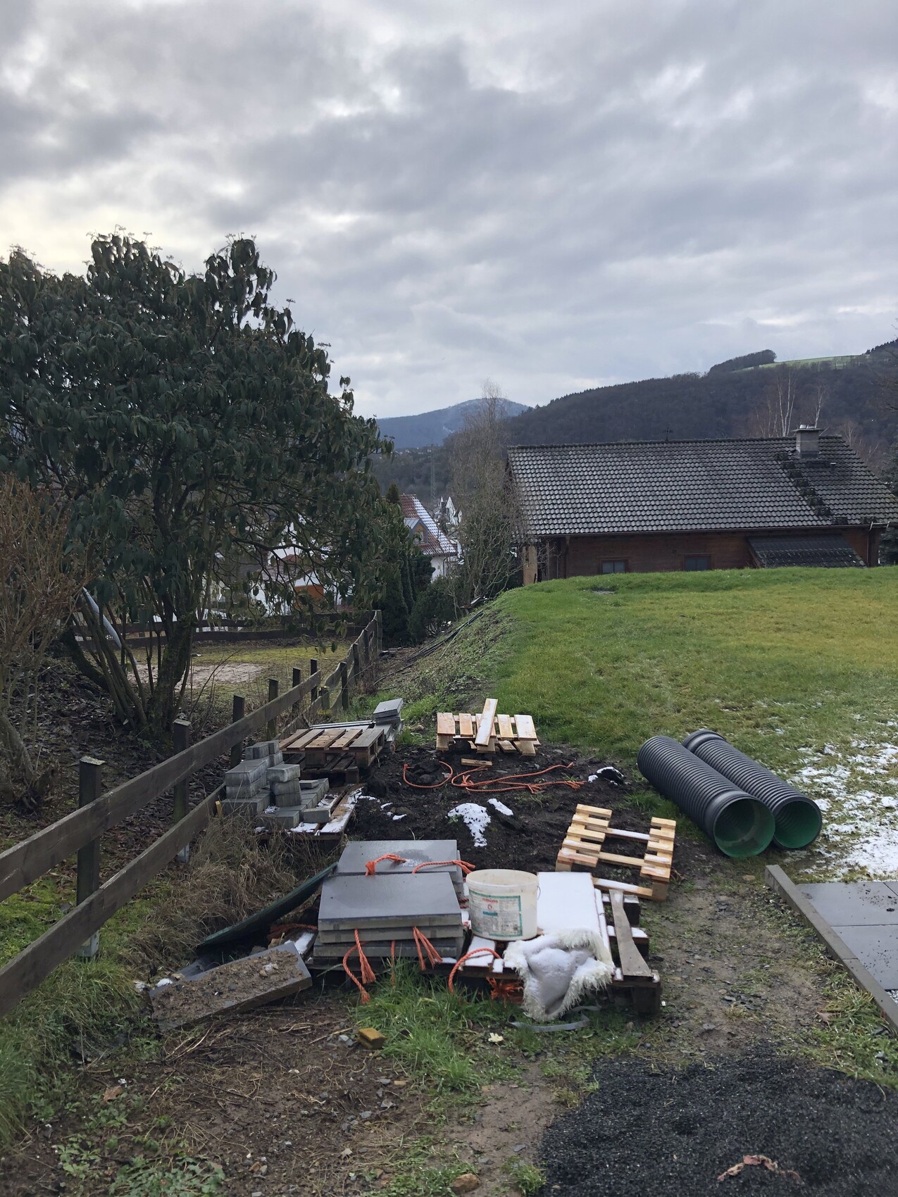 El lado derecho, donde también se ve el muro del vecino, también está inclinado. Esta zona no es tan importante para nosotros, allí plantaremos Thuyas que deben crecer altas.