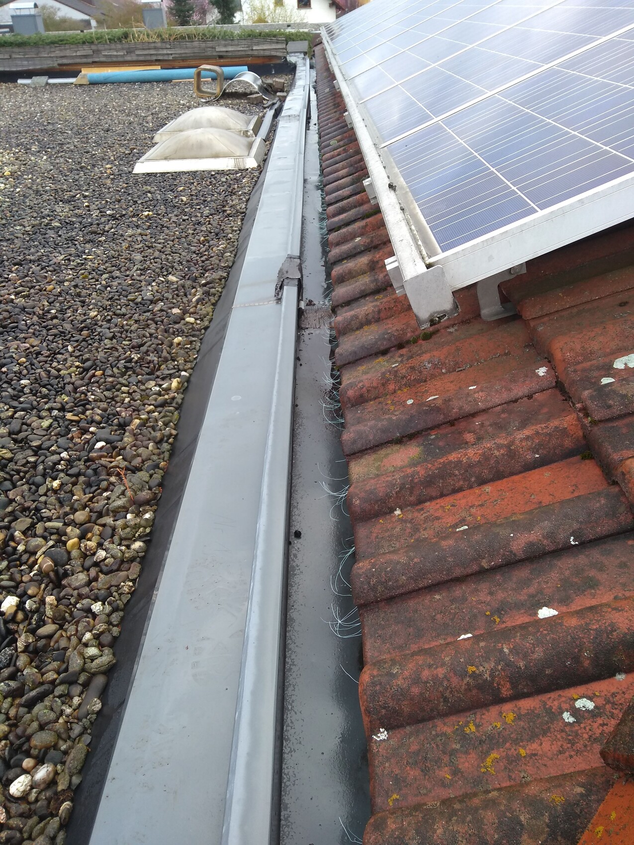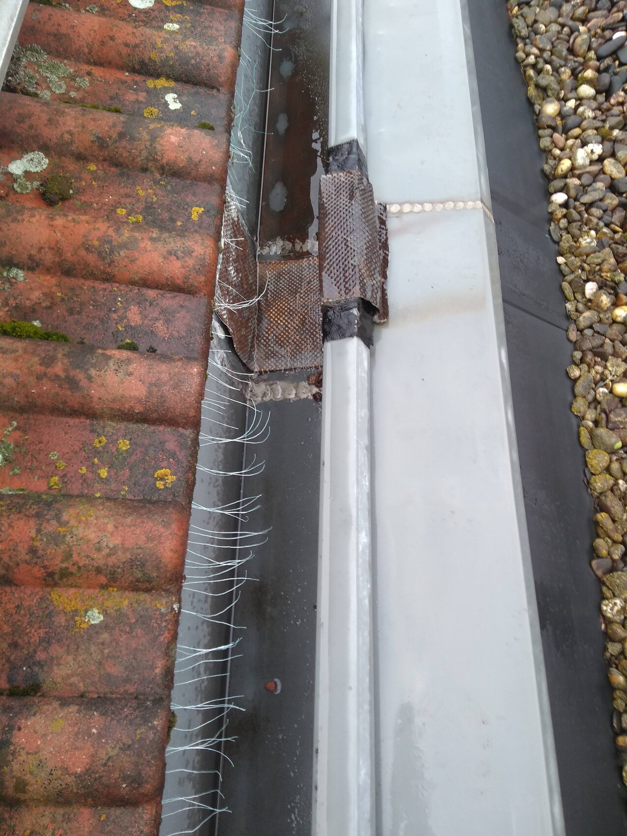 tenemos una canaleta interior con fugas en la zona donde se unen dos casas adosadas.