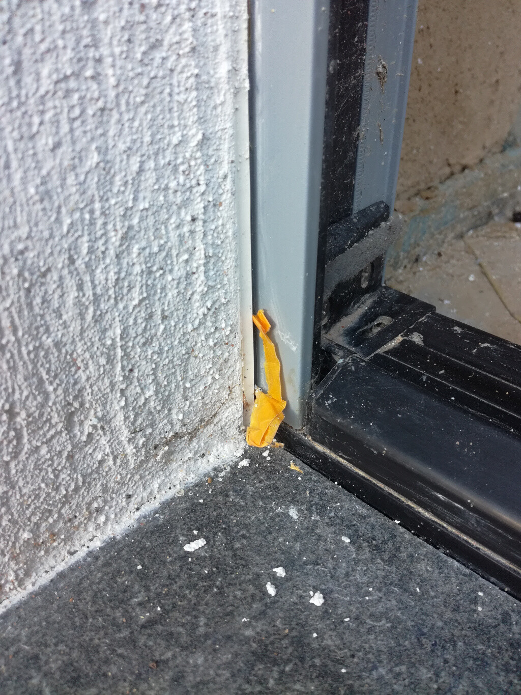 Sin embargo, en nuestro caso, el perfil se ha despegado de casi todas las ventanas y puertas, de modo que ahora hay una separación de aproximadamente 2 mm entre las ventanas y el perfil. Se puede insertar una espátula japonesa o papel unos 2-3 cm detrás. Se descarta que las dilataciones demasiado grandes sean la causa, pues se puede ver que el rango previsto de dilatación del perfil no se ha abierto. En una puerta, la causa fue que el perfil se pegó sobre una cinta adhesiva, pero en las ventanas no fue así. Allí el perfil también estuvo pegado algunos días antes de comenzar los trabajos de aislamiento.
