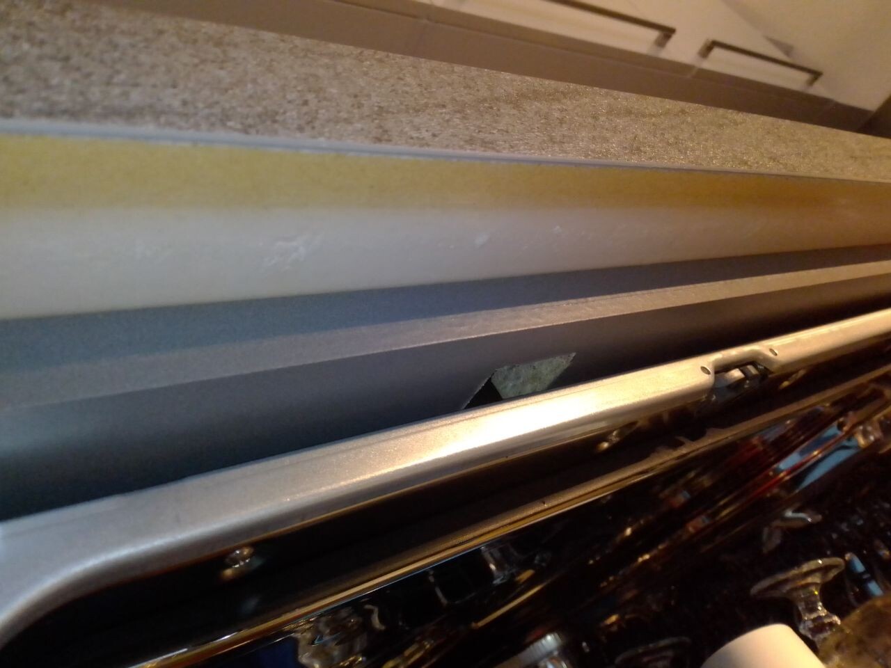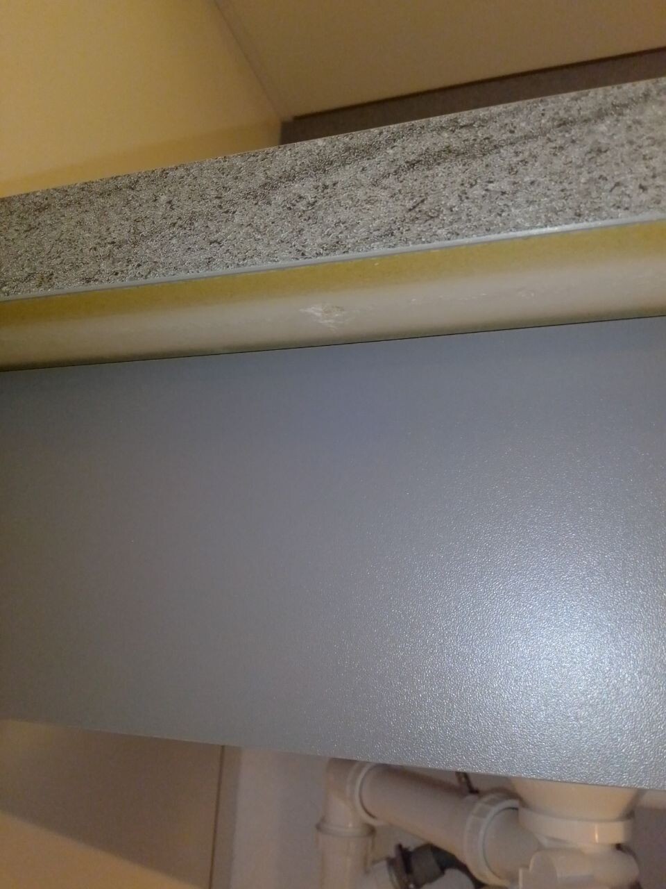 Hemos comprado una nueva cocina Nolte y ahora nos hemos dado cuenta de una capa blanquecina, de varios centímetros de ancho, en la parte inferior de la encimera, y concretamente en el lado donde están el lavavajillas, el fregadero y una frontal de cajón. La capa también está aplicada de manera muy irregular en algunas partes, como se puede ver en las fotos. ¿Se trata realmente, como afirma el vendedor, de una capa protectora que se aplica a lo largo de toda la encimera, no solo en la zona del lavavajillas? Si es así, ¿es normal que presente tales irregularidades? ¿O se ha trabajado de manera descuidada?