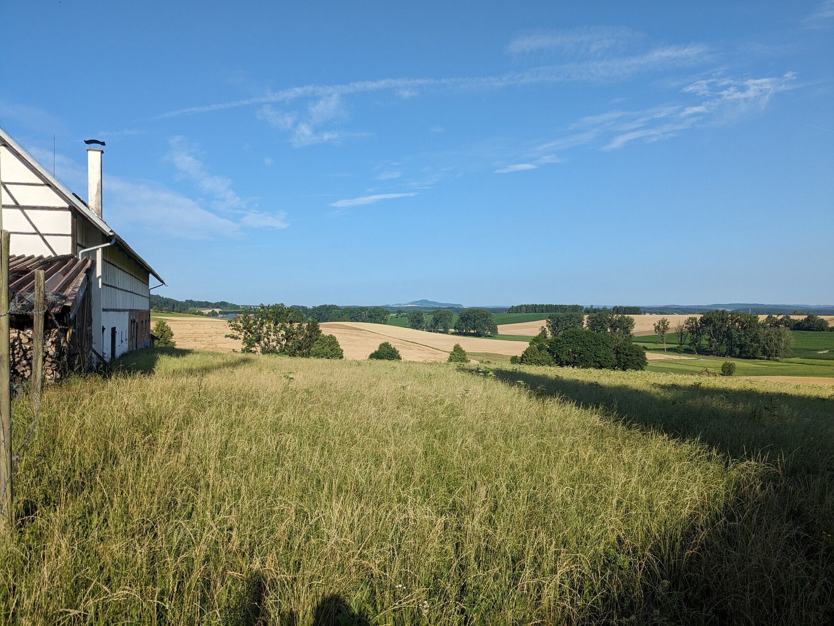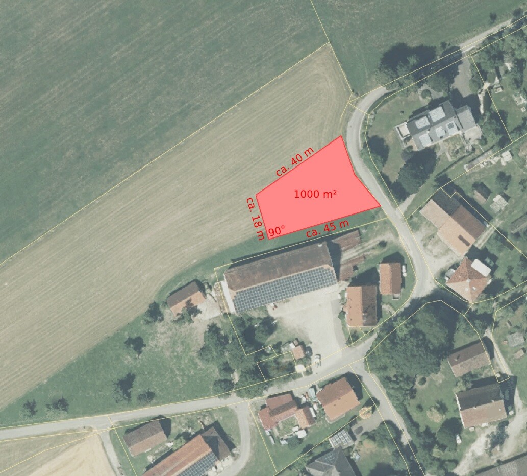 El terreno está situado en una pequeña aldea con vistas despejadas hacia el oeste y el norte. Al este, al otro lado de la calle, hay una casa residencial. Al sur se encuentra un edificio agrícola de 12 metros de altura perteneciente a mi suegro. Por lo tanto, esperamos una gran sombra en invierno. El terreno desciende hacia el noroeste. Lamentablemente, no dispongo del desnivel exacto.