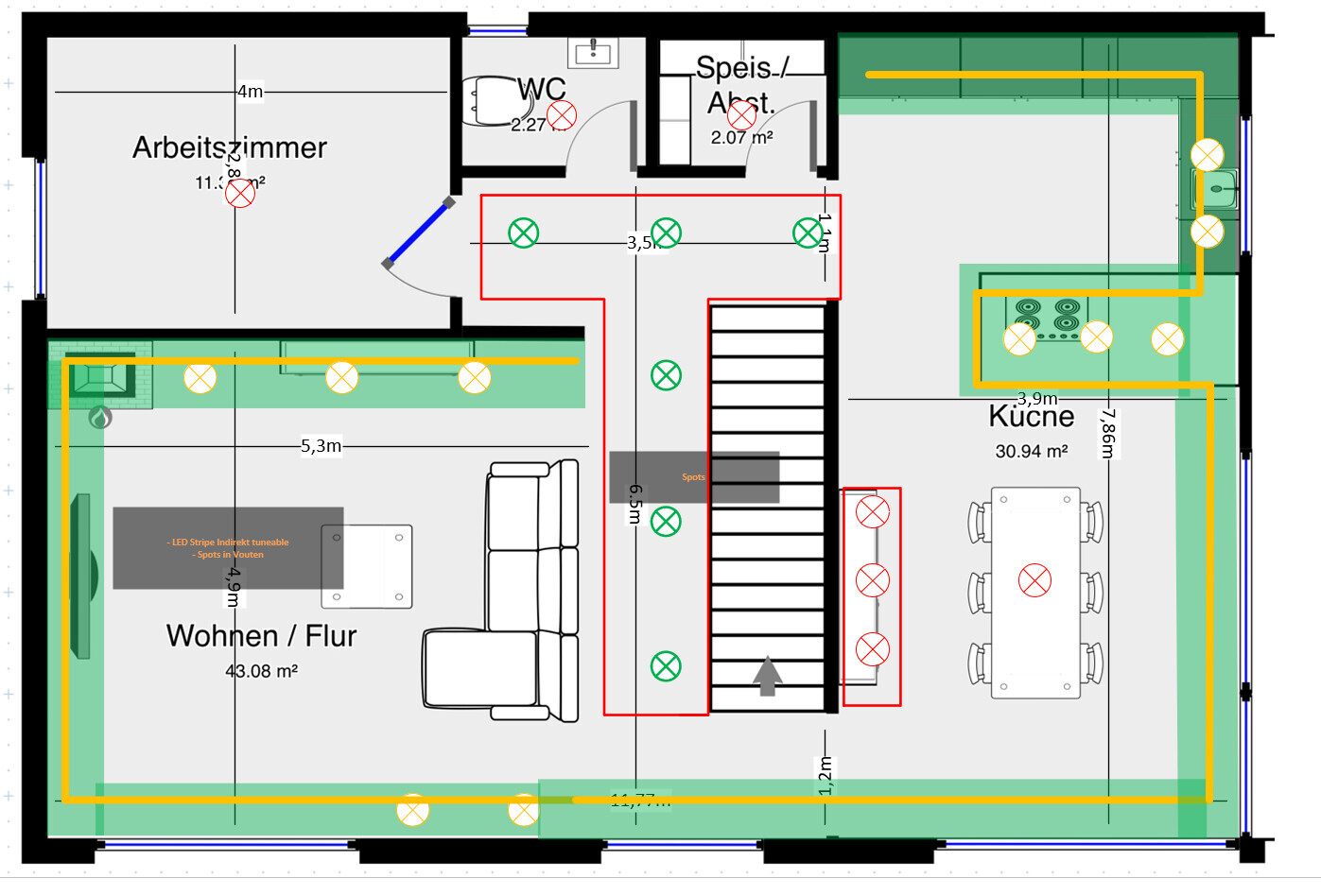 - Amarillo: Spot en elemento de drywall (por eso la cantidad y posición aún es variable)