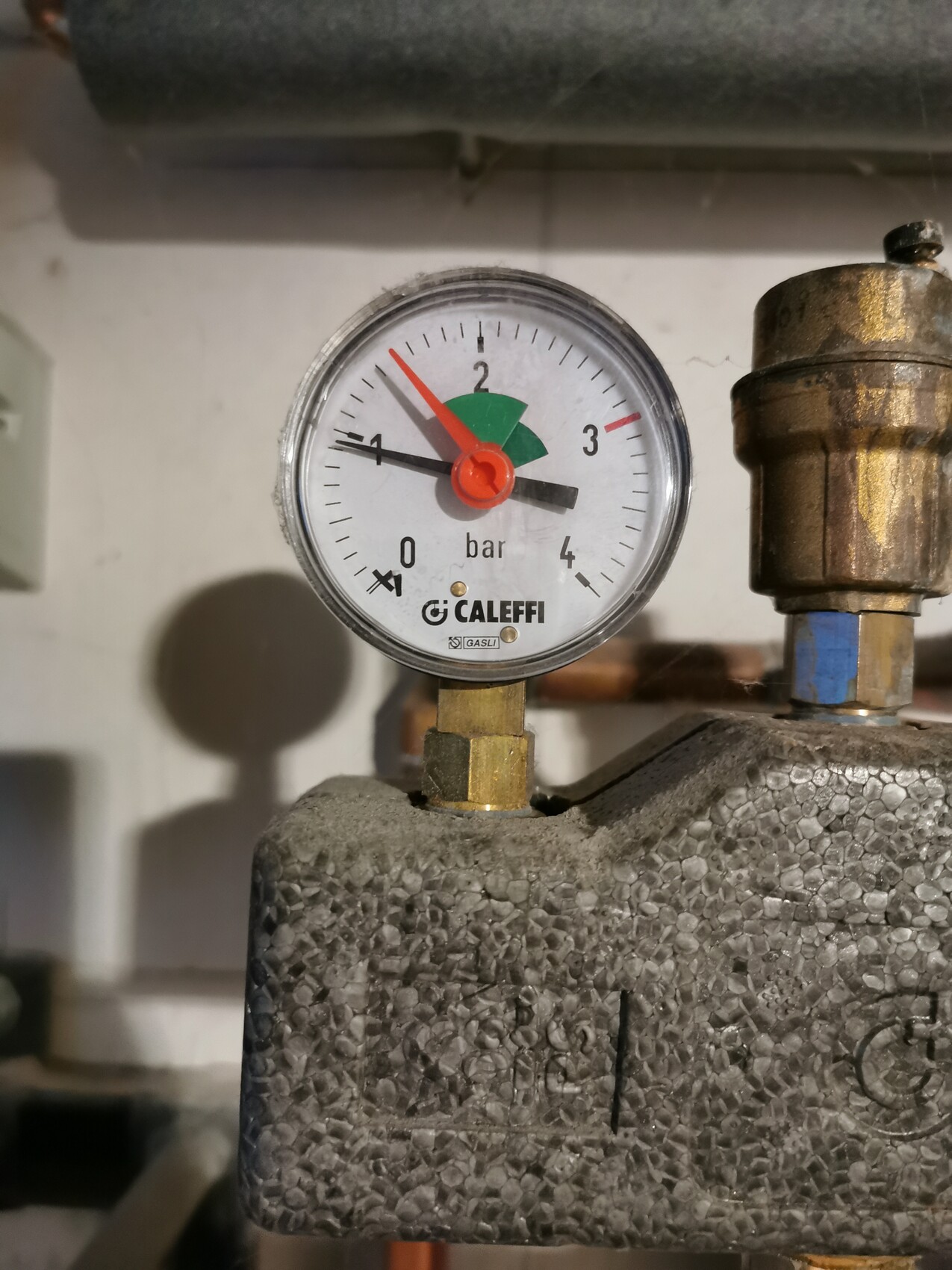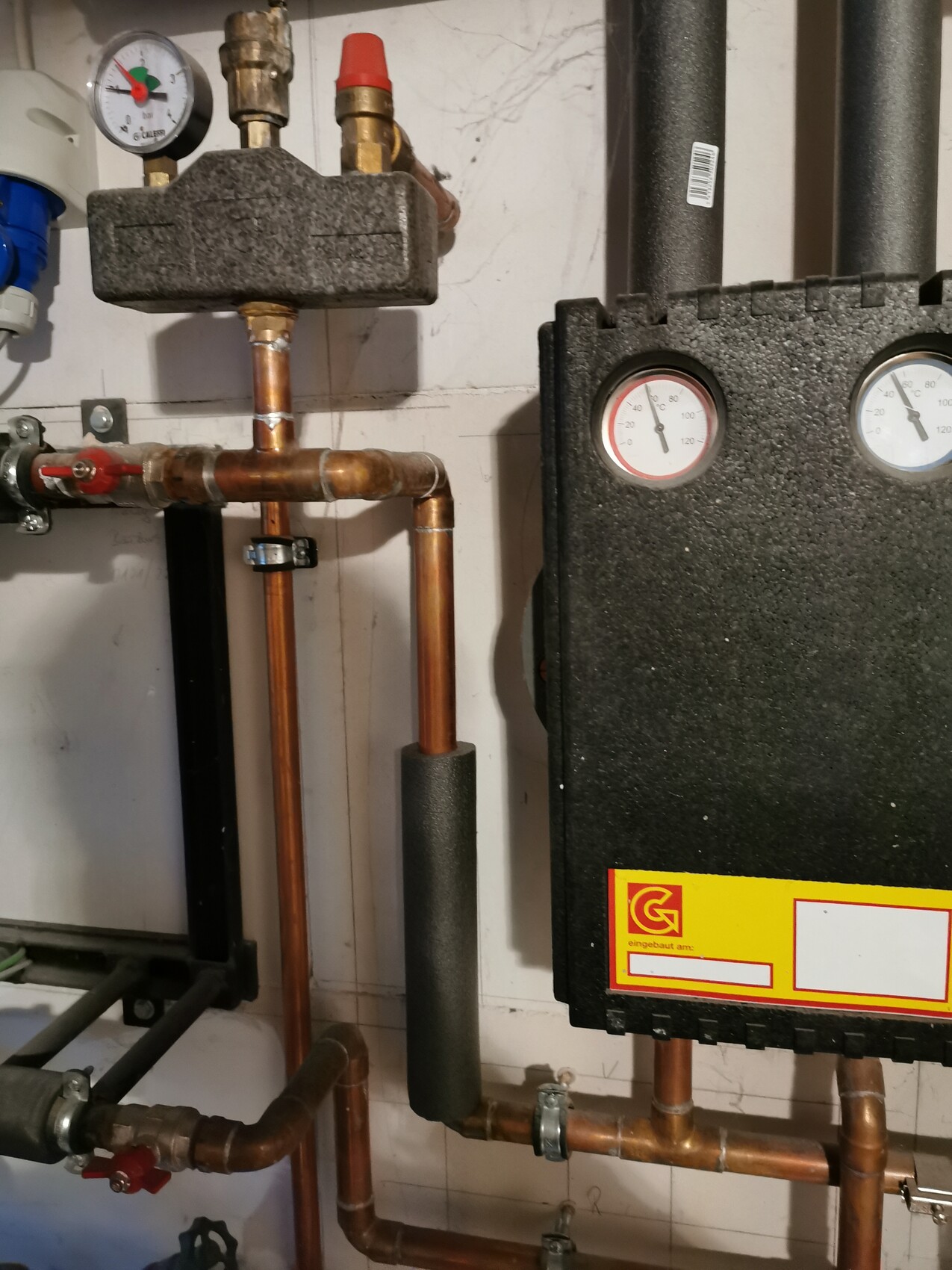 3. Ahora, por supuesto, también se trata de rellenar el agua faltante después del montaje. Tras investigar, ya noté que aparentemente falta presión en el sistema de calefacción, el manómetro marca solo 0,9 bar, se recomiendan 1,5 bar. Es una calefacción de red urbana. Lamentablemente no estoy seguro de dónde puedo llenar el agua adicional. En un video explicativo solo había un acceso en el sistema de ejemplo, yo tengo cuatro.