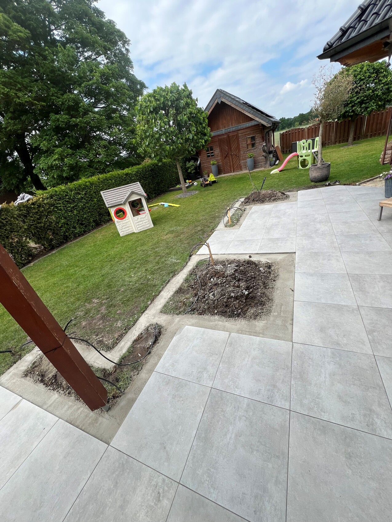 La pendiente de la terraza va en dirección a los futuros bancales y luego hacia el césped. Seguramente se acumulará algo de agua en las esquinas a pesar de la pendiente.