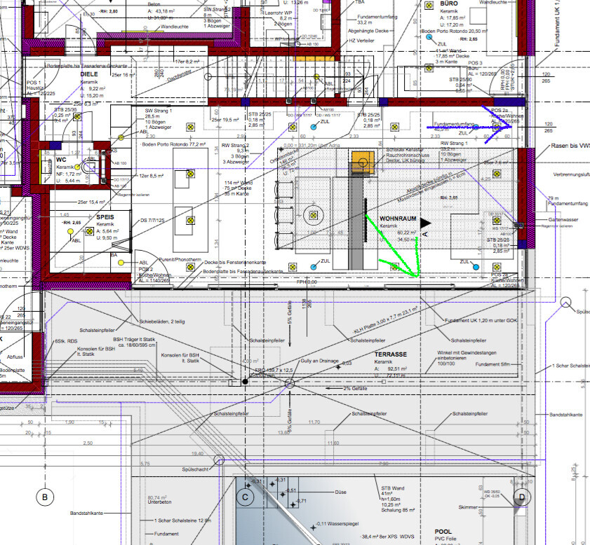 Estamos más bien en contra, porque aquí se trata de un coste elevado y ya tenemos una puerta corredera. Claro que un acristalamiento fijo y una puerta abatible (flecha azul) también cuestan algo, pero aún así queda una diferencia aproximada de unos 4.500 euros. Por otro lado, nos preguntamos si no nos molestará muchísimo no hacerlo...