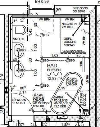 hemos planificado una ducha a nivel del suelo en la esquina (ver plano), estará separada por un lado con una pared de vidrio (en el plano orientada verticalmente desde la pared con la ventana), y un lado hacia la bañera independiente queda libre. Está planificada una ventilación central controlada de la vivienda.