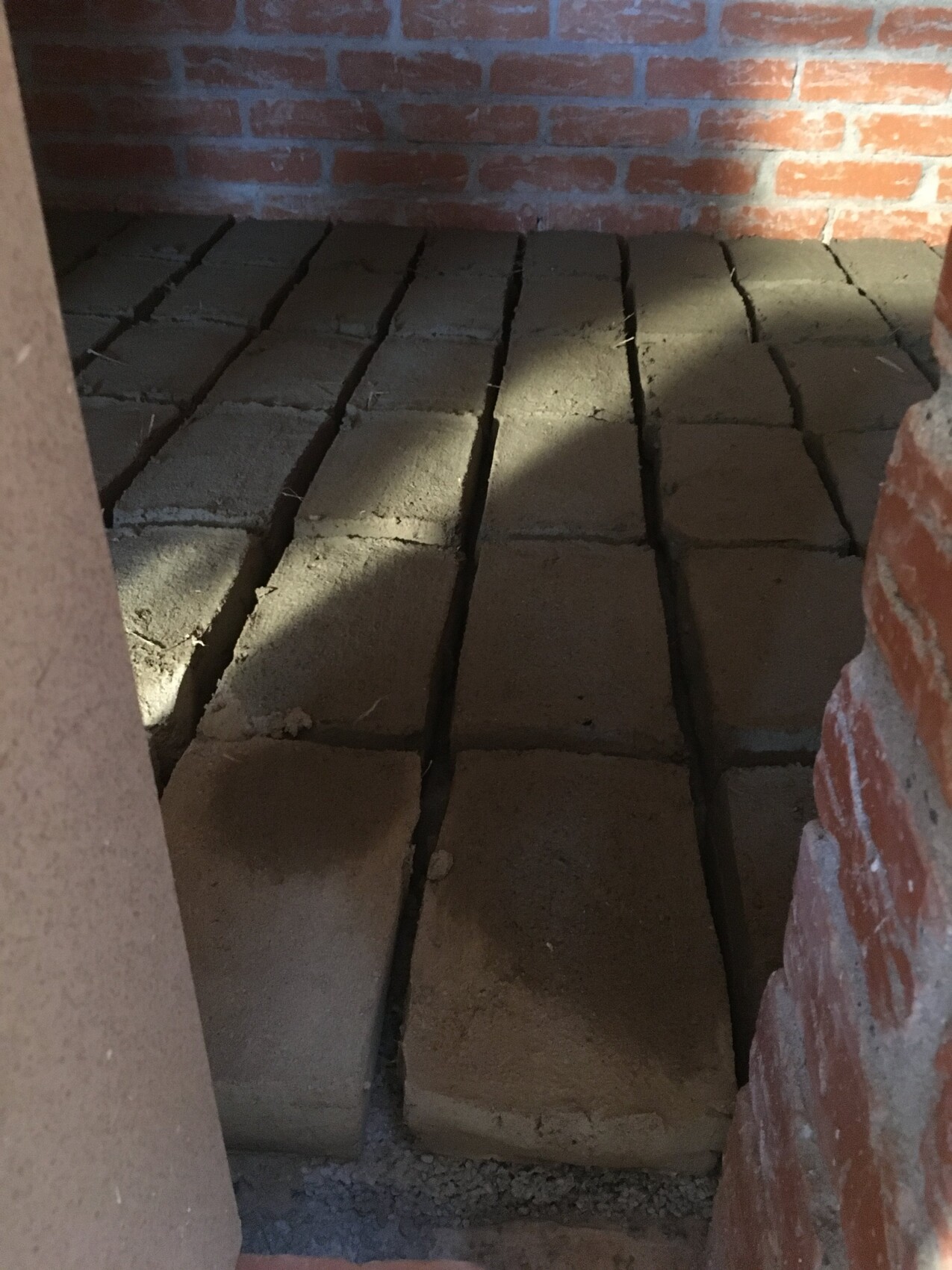 Le sol de la cave est une dalle en béton, sur laquelle nous avons maintenant posé des briques en terre crue (30x15 cm) d’une épaisseur de 8 cm.