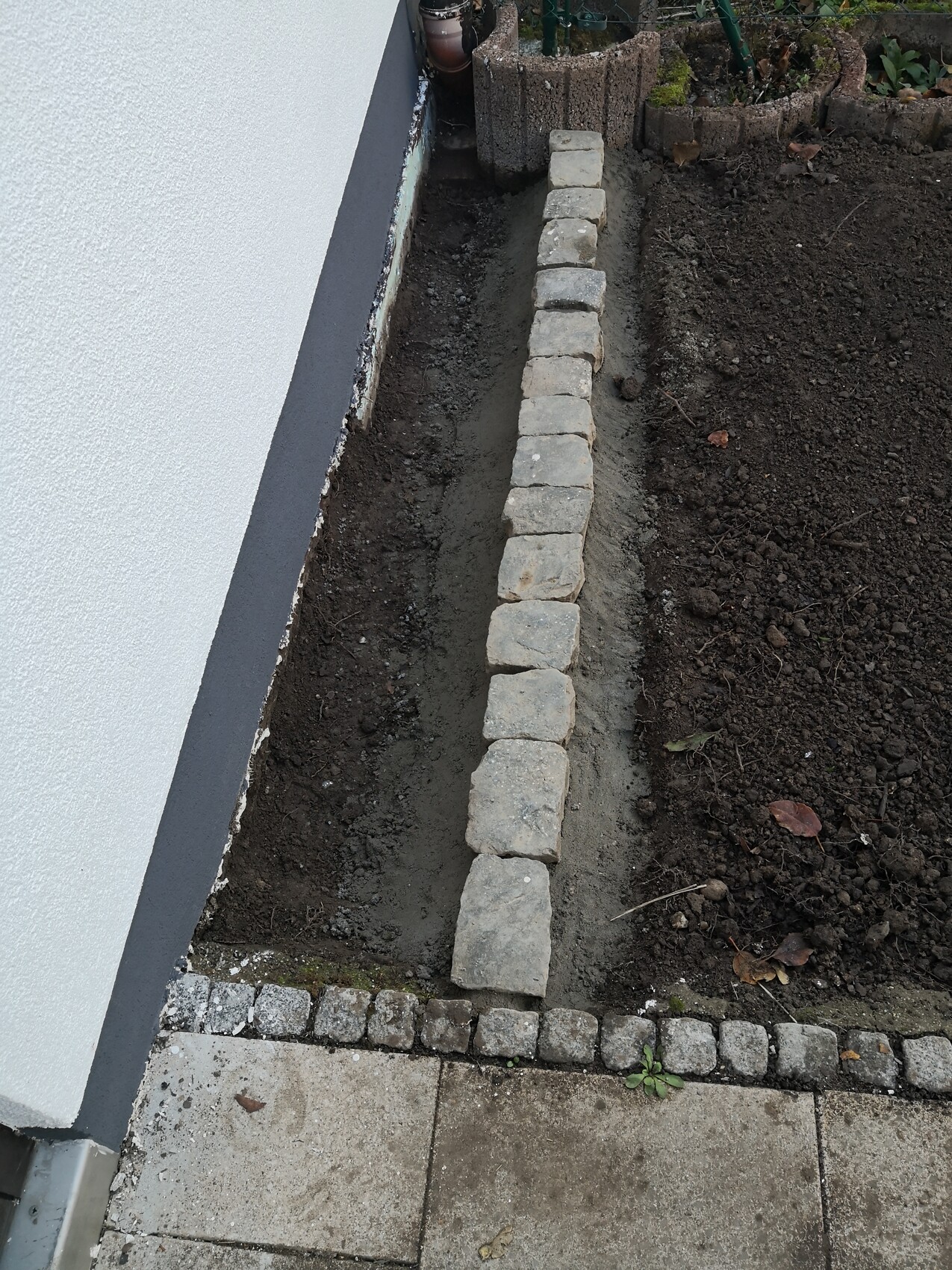 Mise à jour : Nous avons essayé au niveau du garage et avons déjà posé des pierres existantes. Je n’ai pas encore acheté de gravier, j’ai lu qu’il valait mieux le commander que l’acheter en magasin de bricolage.