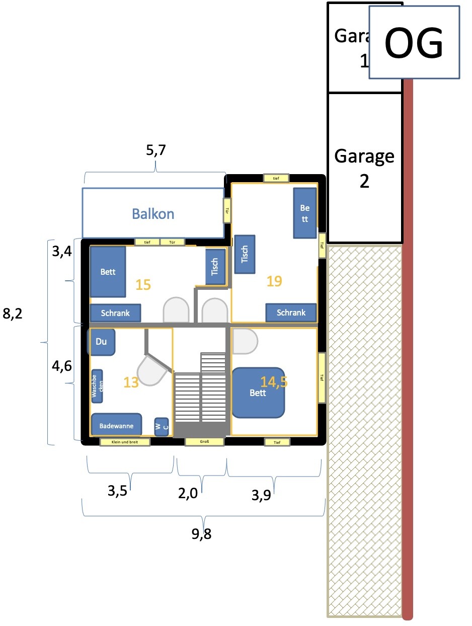 nous prévoyons (après la démolition de la moitié de maison mitoyenne existante) la construction d’une nouvelle moitié de maison mitoyenne et avons déjà esquissé des plans. Votre avis à ce sujet et vos suggestions d'amélioration nous intéressent beaucoup. Nous ne sommes pas encore vraiment satisfaits surtout de la répartition à l’étage.