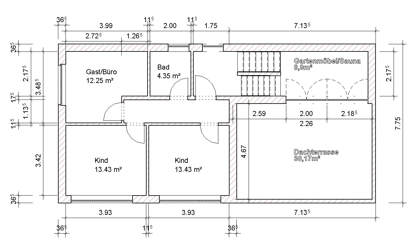 Nous réfléchissons encore à savoir s'il serait judicieux de déplacer le mur sud des chambres d'enfant un petit peu vers le sud pour agrandir un peu les pièces.