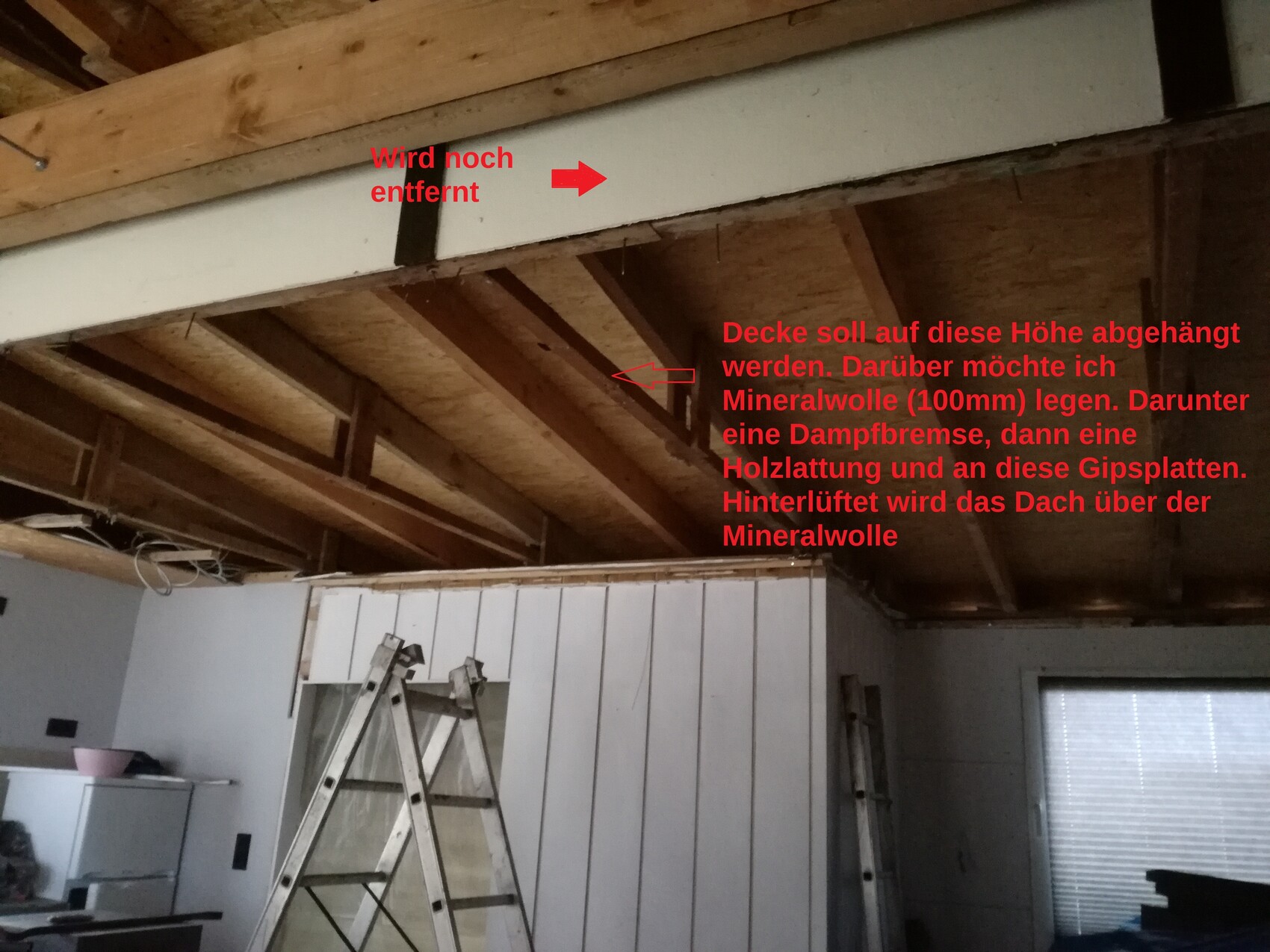 je vous serais très reconnaissant pour une réponse experte. Je suis en train d'aménager une tonnelle. Le toit est composé de panneaux OSB de 23 mm. Au-dessus, il y a une membrane anti-rongeurs et une membrane bitumineuse. Maintenant, ma question : je voudrais insérer des panneaux isolants normaux en tant qu'isolation entre les chevrons (voir photos). Cela a-t-il un sens et surtout, y a-t-il un risque de condensation quelque part ? Le toit est ventilé par des trous dans la boîte de toit (environ 5 cm de diamètre et espacés d'environ 60 cm). Je veux suspendre le plafond avec une structure en bois. C’est-à-dire mettre un lattage au niveau et poser de la laine isolante (100 mm) dessus. Sous le lattage, une pare-vapeur et un second lattage transversal sur lequel je voudrais visser les plaques de plâtre. Est-ce que ma construction a du sens ou suis-je complètement à côté de la plaque ? Je vous remercie pour vos réponses