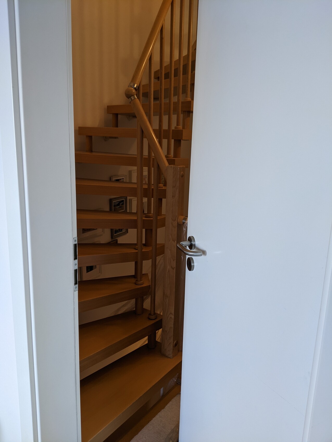 Il n’y a pas de cave, mais il y a une lame de parquet en chêne pour le salon en essai, ce sera probablement, après l’escalier, la prochaine chose à faire.