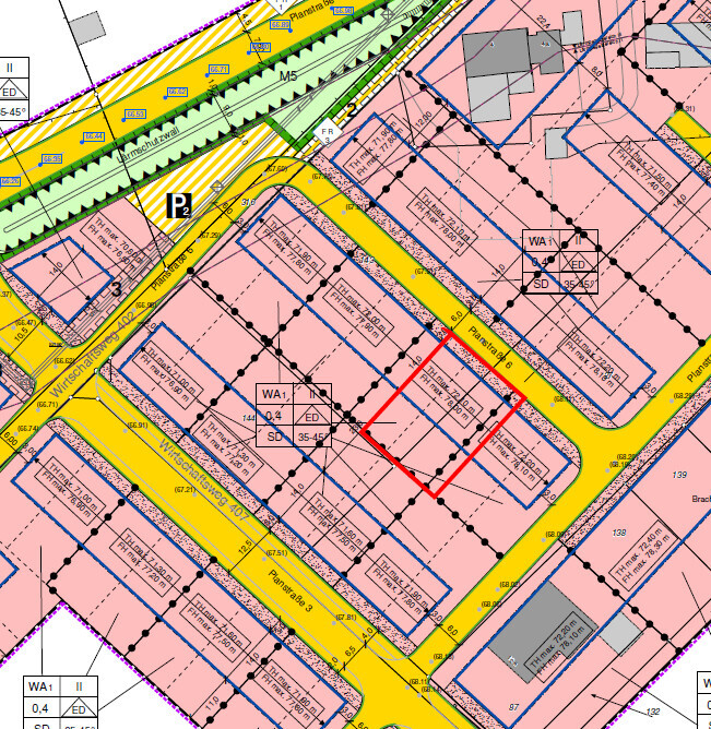 Pour la vue d’ensemble, voici un extrait du plan d’urbanisme. Le terrain se trouve à peu près dans la zone rouge.