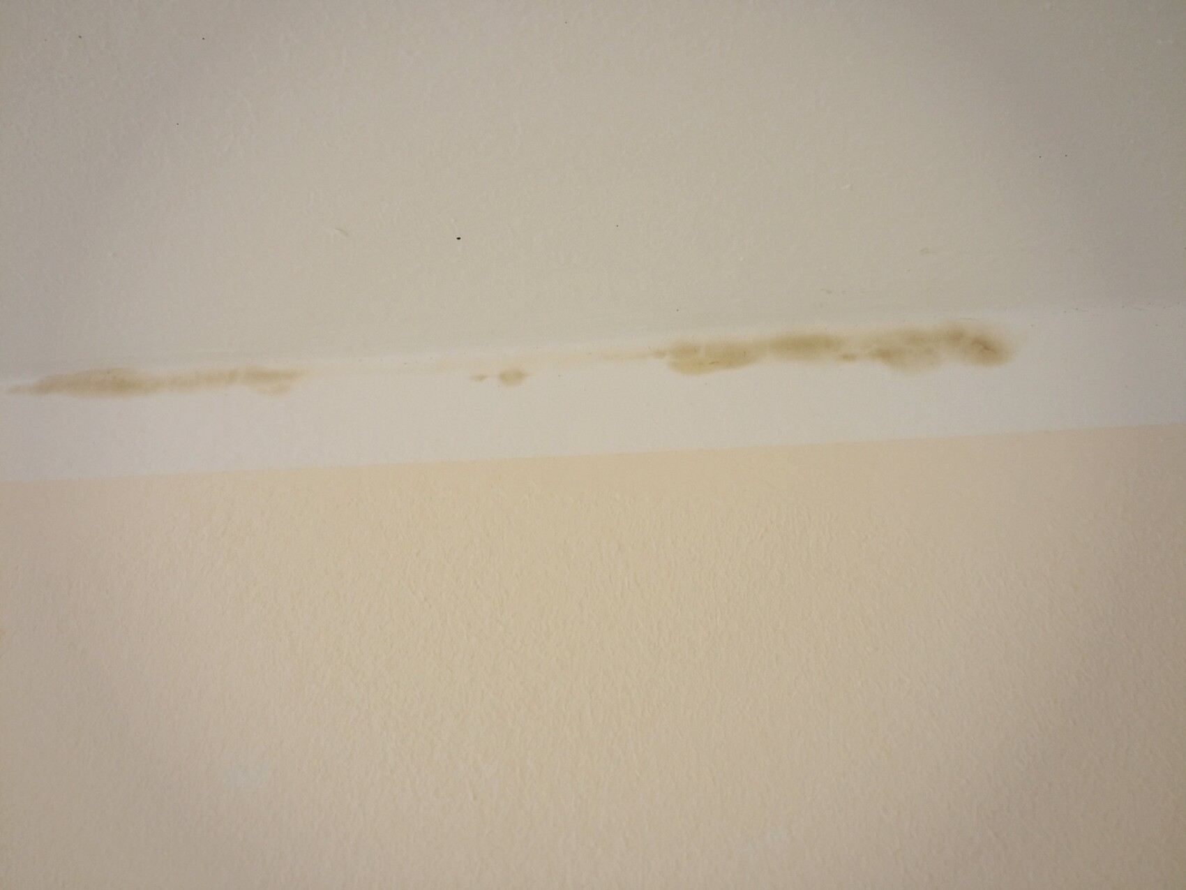 Cela fait un an que nous habitons dans notre maison neuve. Au rez-de-chaussée, et uniquement dans le couloir, deux taches se sont très lentement développées à la jonction du mur latéral et du plafond. Environ 2 cm sur 25 cm... légèrement beige/brunâtre. Mon appareil de mesure ainsi que celui de l'artisan qui avait installé à l'époque les tuyaux/la salle de bain/le chauffage, ne détectent aucune humidité aux innombrables endroits testés dans les murs. Tous les examens à l’étage supérieur, par exemple la salle de bain avec lavabo/baignoire, la chambre, etc., ne révèlent aucune défaillance et aucun endroit au sol ou sur les murs ne présente d’humidité.