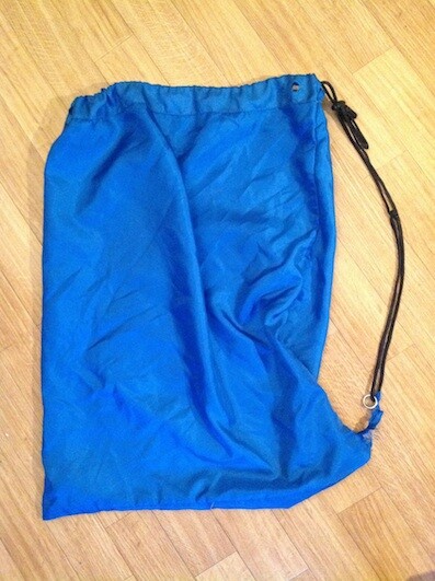 यह नीला और चमकीले नायलॉन कपड़े का बना है। साइड में एक काला डोरी है, जिससे बैग को बंद किया जा सकता है और कंधे पर भी डाला जा सकता है।