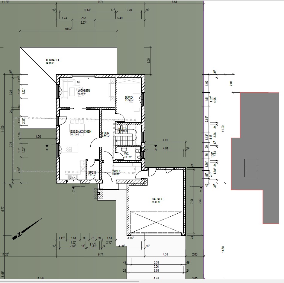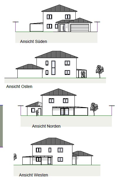 Mit der Garage auf der rechten Seite wollten wir eine Art Sichtschutz (u.a. für den Eingangsbereich) schaffen, da direkt an der Grenze die Terasse/Wintergarten vom Nachbar ist. Und das Haus sollte jedoch möglichst weit rechts Richtung Nachbar, um eben möglichst viel vom Garten (Süd/West) auf der linken Seite nutzen zu können.