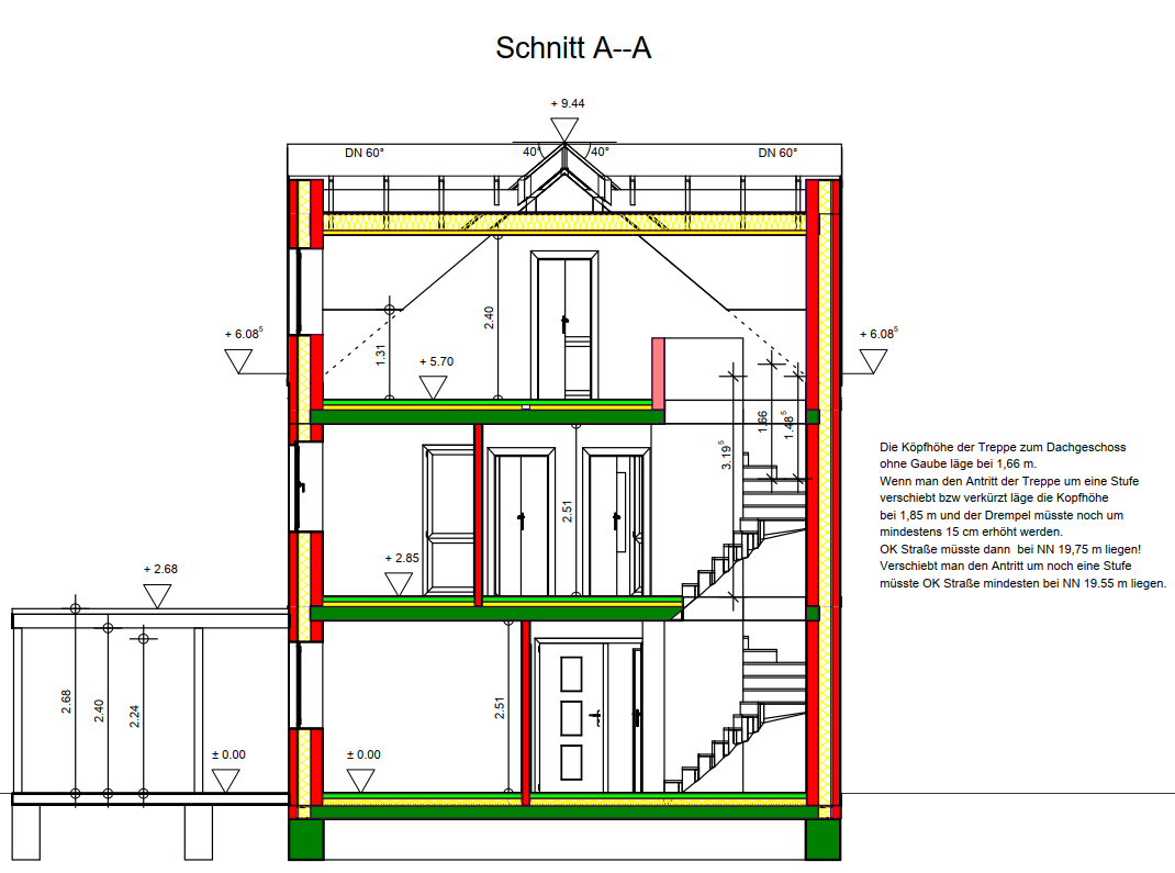 Hier wird ein eigentlich angemessenes Eigenheim (Wohnflächenklasse "Bescheiden plus") mit fetten Außenwänden und einem großzügigen Heuboden als Überabstellraum überladen. Die Treppenlage wäre für ein Haus dieser Breite genau richtig, wenn - ja, wenn ! - die Firstlage des Nebenfirstes diejenige des Hauptfirstes wäre.