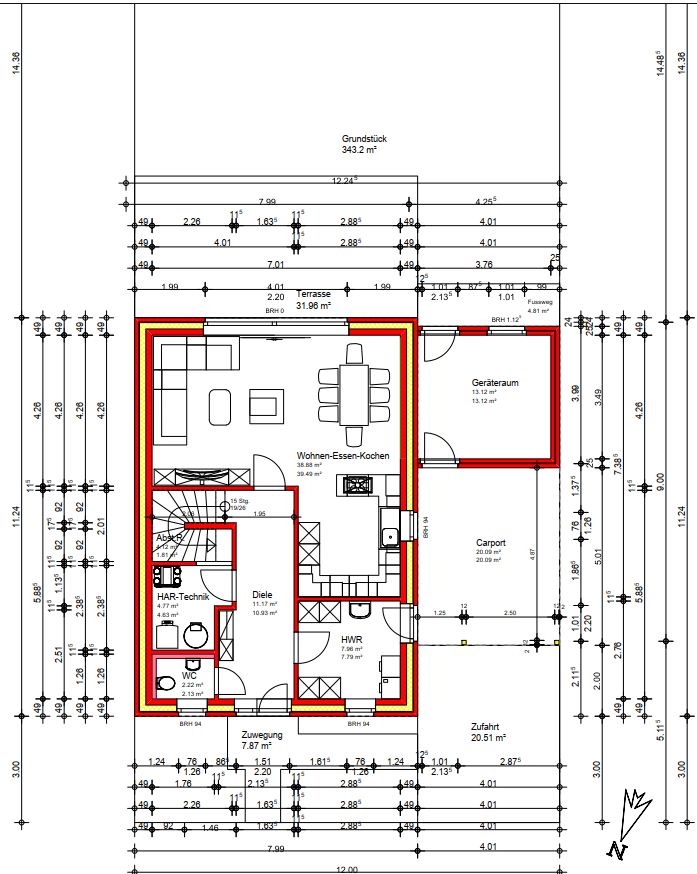 Mir persönlich wäre der Entwurf zu langweilig. Die Diele verhältnismäßig groß und ohne weiteren Wert. Ob man jetzt die Seitentür im Hauswirtschaftsraum braucht? Letztendlich wird dort die Wäsche gewaschen, muss man ja nicht noch diesen Raum mit Straßenschuhen begehen, zumindest nicht als Eingang und erweiterten Flur missbrauchen, wenn doch schon ein Flur mit Eingangstür geplant ist.