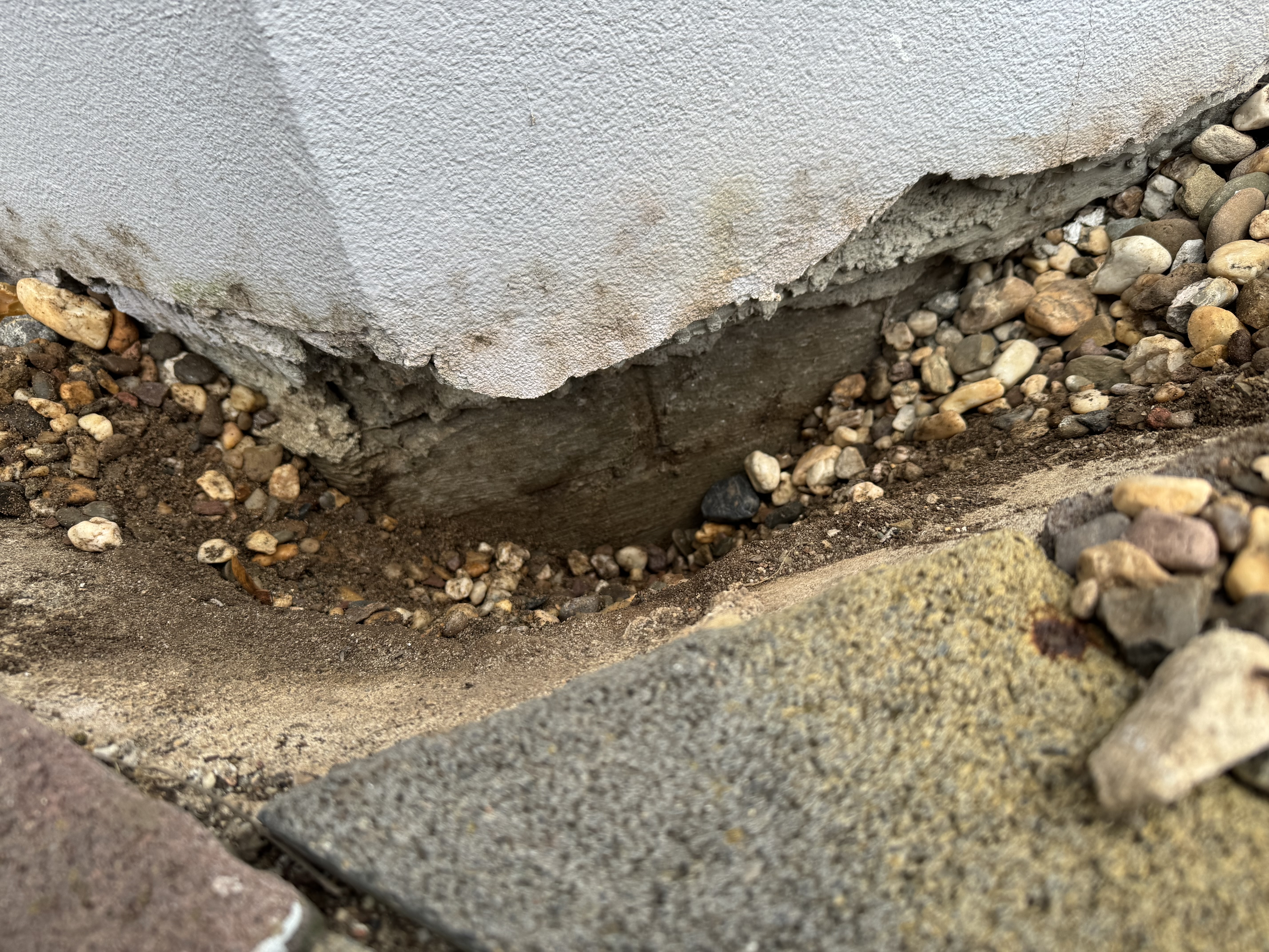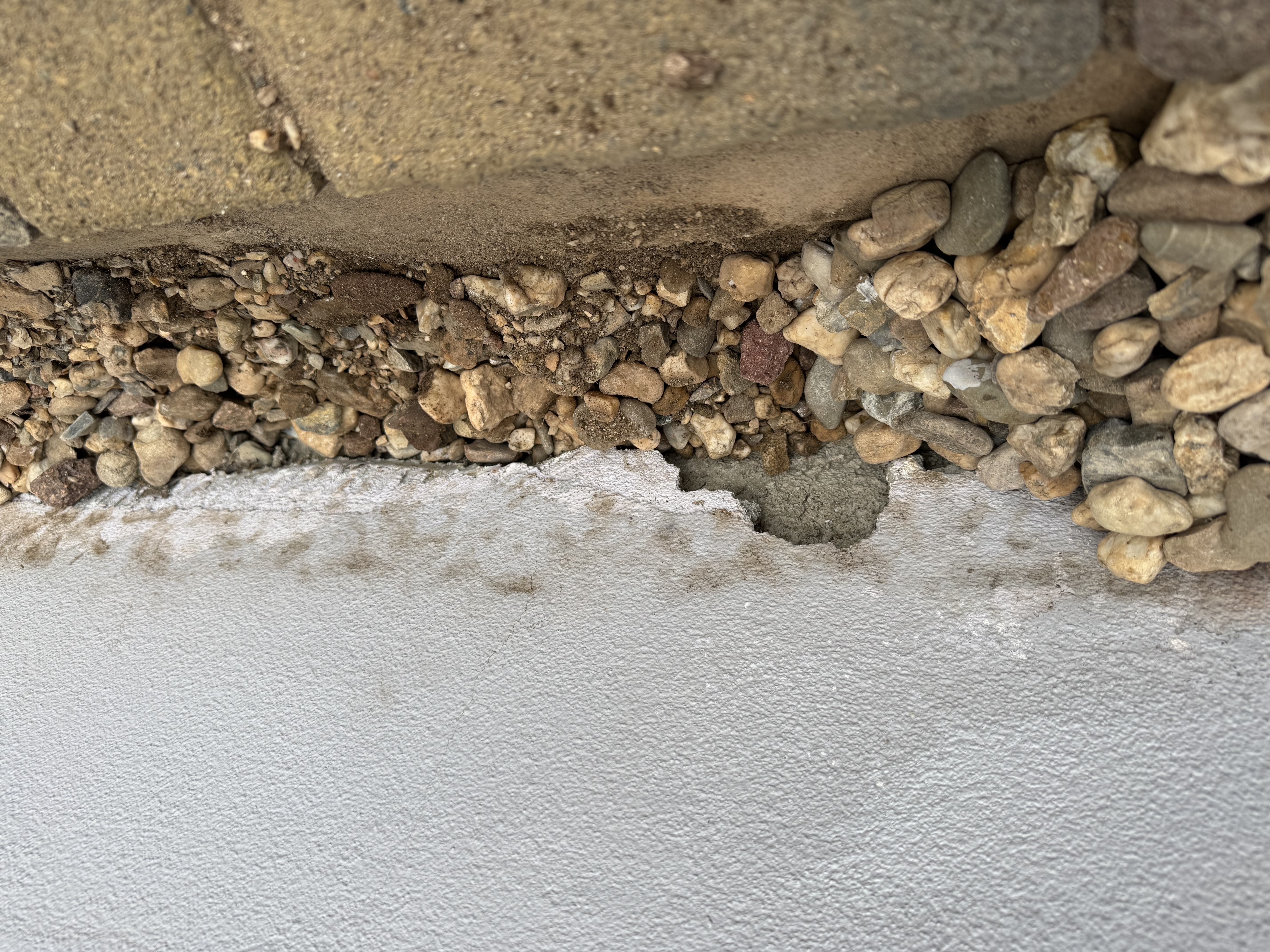 Aber TÜV-ig sieht das Gesamtbild nicht aus…und das sind nur ca. 4m von > 30m. Der Vorbesitzer war natürlich fleißig und hat bis unter OK Kiesbett den Sockel gestrichen. Die leichten Haarrisse über OK Kiesbett kannten wir, erschien uns aber normal für dieses Alter.