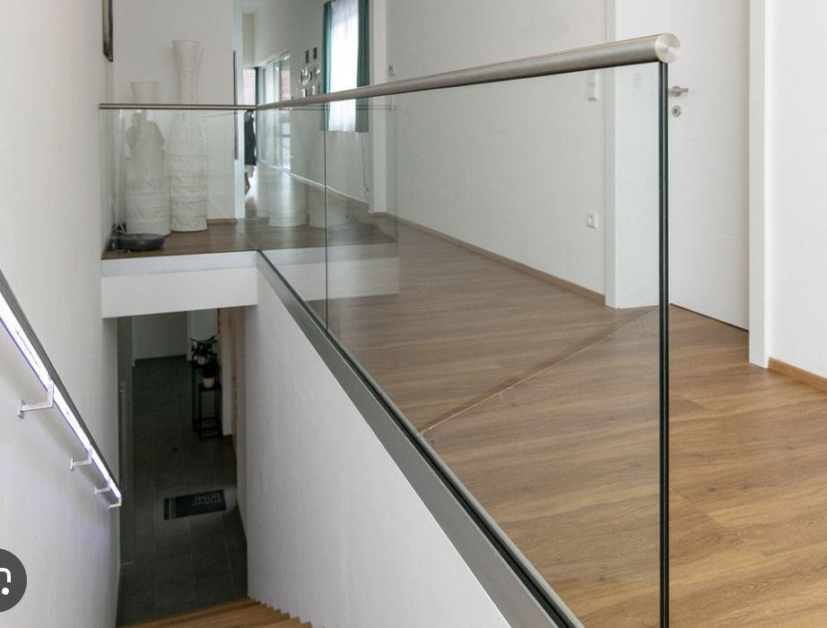 - Das Glasgeländer kann angeschraubt werden seitlich, allerdings hätten wir eine andere Vorstellung gehabt (s. Bild). Im OG soll das Geländer ebenfalls aus Glas sein und rund um den "Treppenabgang" gehen. Es soll (nach unserem Geschmack) direkt in den Estrich verankert werden, sodass die Bodenprofile den Abschluss des Bodens in Richtung Treppe bilden.