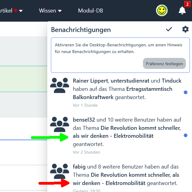Der Button "Alle Benachrichtigungen" führt auf eine leere Seite im eigenen Profil. Wäre vielleicht schön, wenn es ähnlich wie in einem anderem Forum gelöst ist. Grün der Einstiegspunkt ab dem ich noch nicht gelesen habe, rot quasi die "alte" Benachrichtigung, die ich schon gelesen hatte. Dabei auch bitte nicht für jeden Beitrag, der in einem Thread geschrieben wird, eine eigene Glocke, sondern ähnlich wie auch unten im Muster erkennbar: