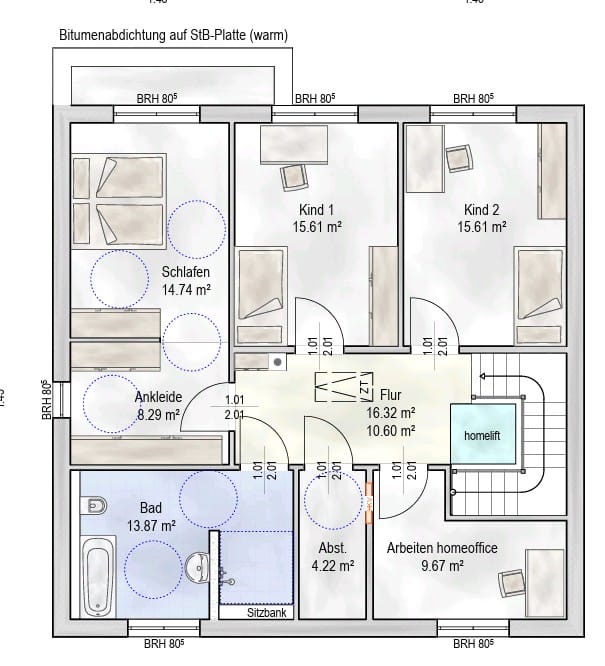Raumbedarf im OG: Schlafzimmer mit Ankleide, zwei Kinderzimmer, Arbeitszimmer, Bad mit Wanne und Dusche