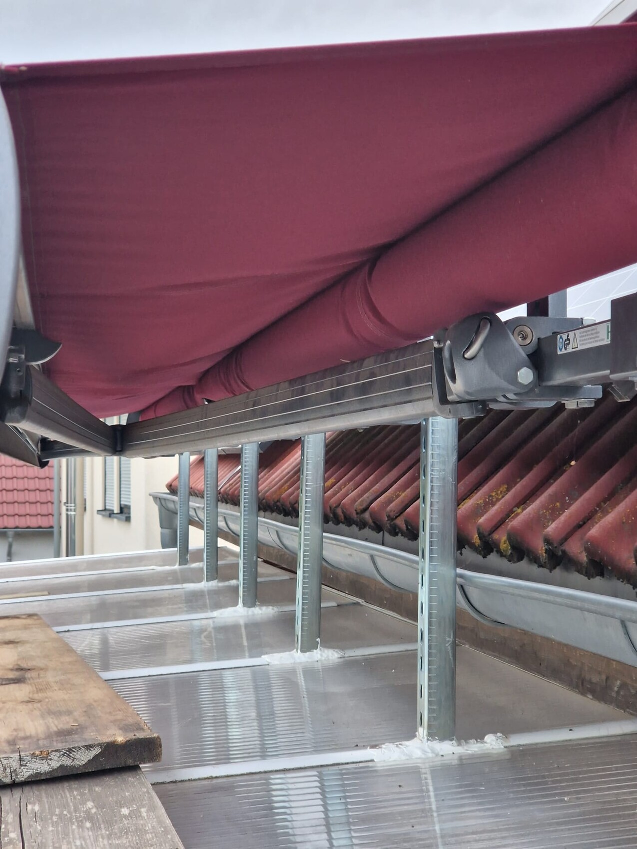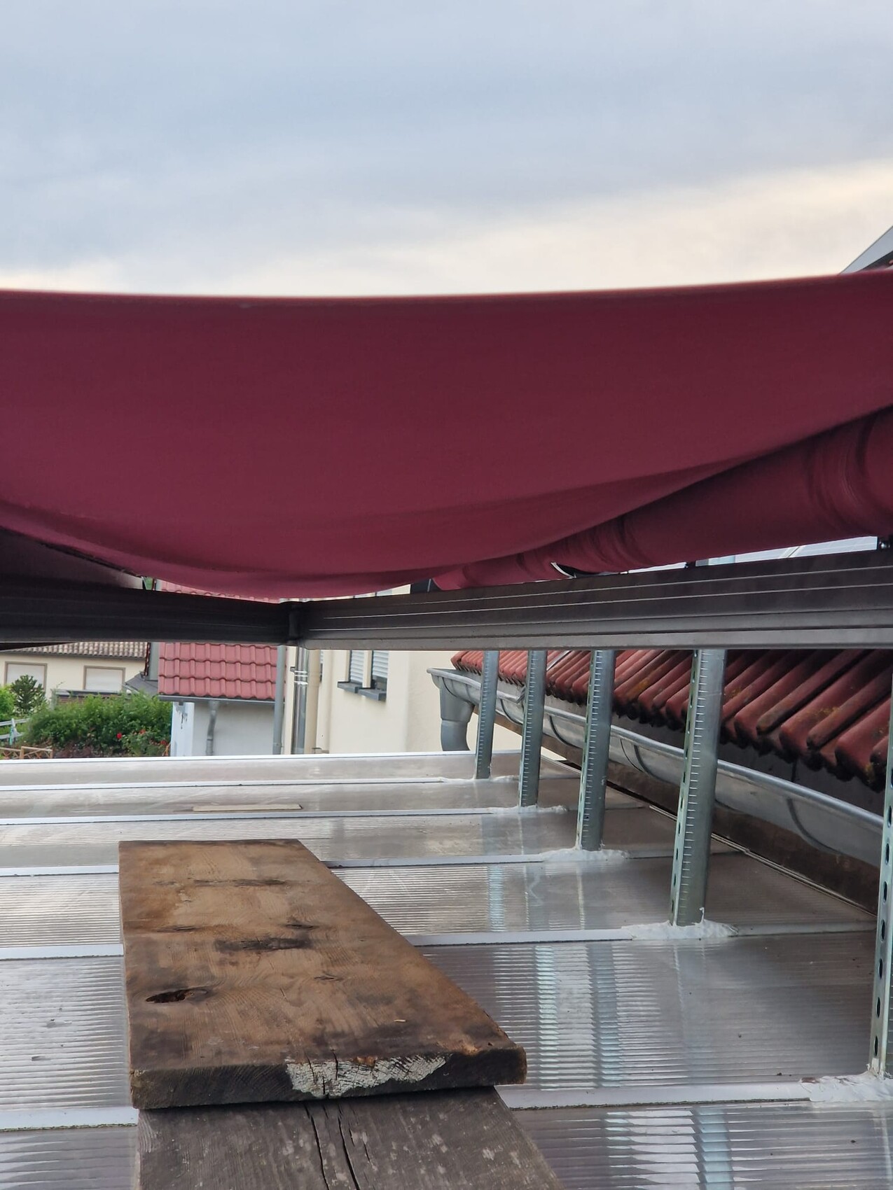 Hinzu kommt, dass ich die Markise mit einer eher flachen Neigung montieren musste, damit es keine Konflikte mit dem vorhandenen Terrassendach gibt. Das schränkt vermutlich die Ablaufmöglichkeit des Tuchs etwas ein, aber eine stärkere Neigung war baulich nicht machbar.