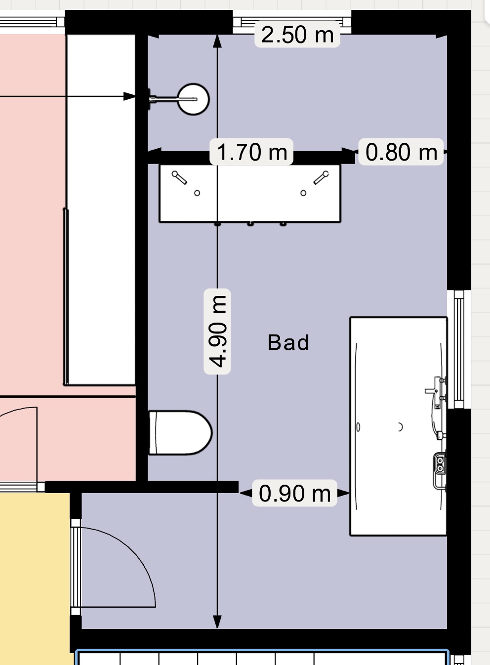 Im Plan ist aktuell ein 50 cm Waschbecken eingezeichnet.