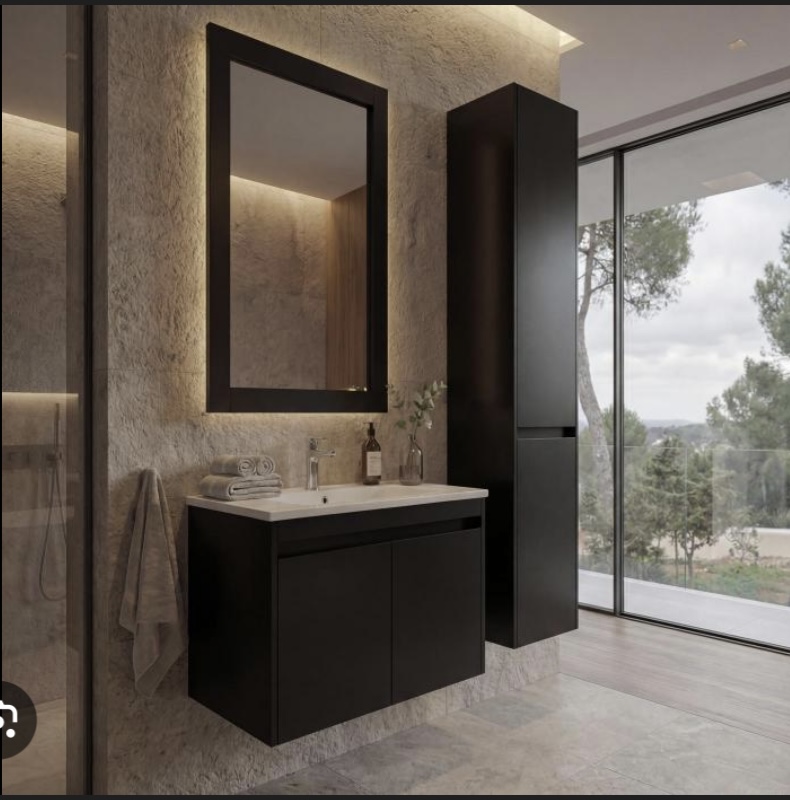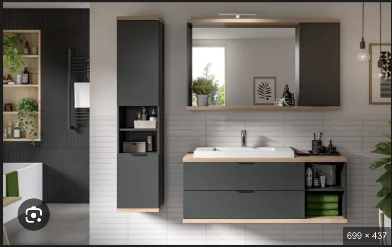 • gleichzeitig hinten evtl. mehr „gefühlte Breite“ im Durchgang, weil ein Hängeschrank nicht so tief baut wie das Waschbecken/Waschtischunterschrank und dieser mehr Richtung Eingangsbereich rutscht