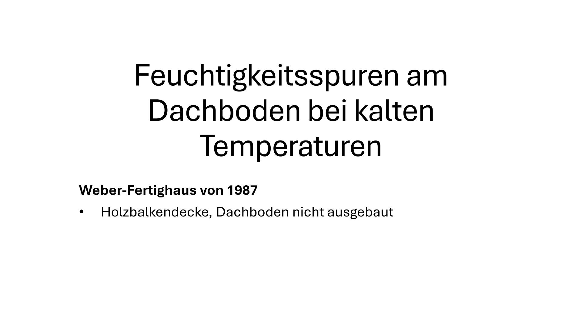 wir haben im vergangenen Jahr ein Weberhaus Fertighaus in Holzständerbauweise gekauft (Baujahr 1987) und in diesem Winter Feuchtigkeitsspuren am Boden des kalten Dachbodens entdeckt, die sich entlang einer Linie zeigen. Es handelt sich um eine Holzbalkendecke mit Hinterlüftung, wobei es etwa 10cm Breite Lüftungsschlitze gibt. Die stärksten Feuchtigkeitsspuren zeigen sich über den Badezimmer.