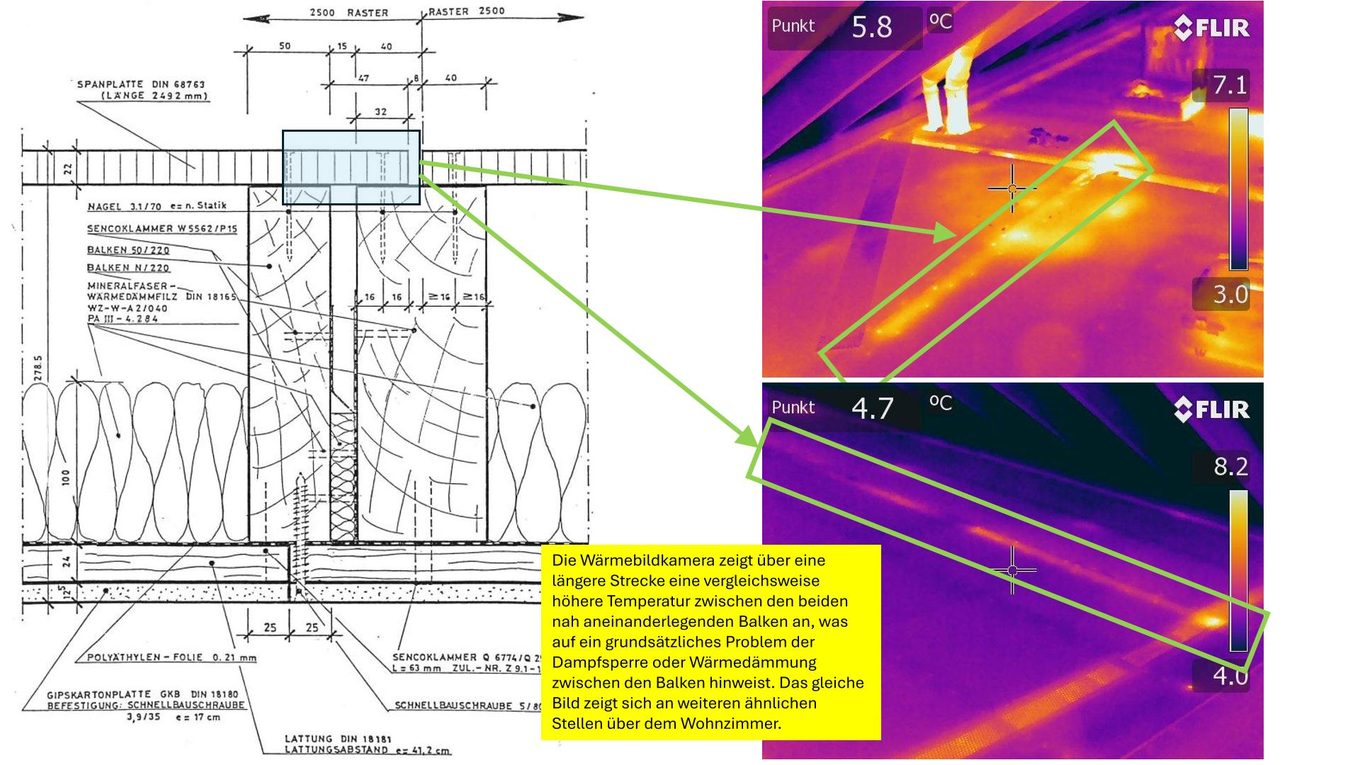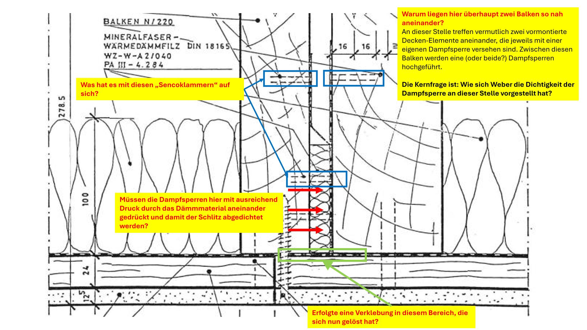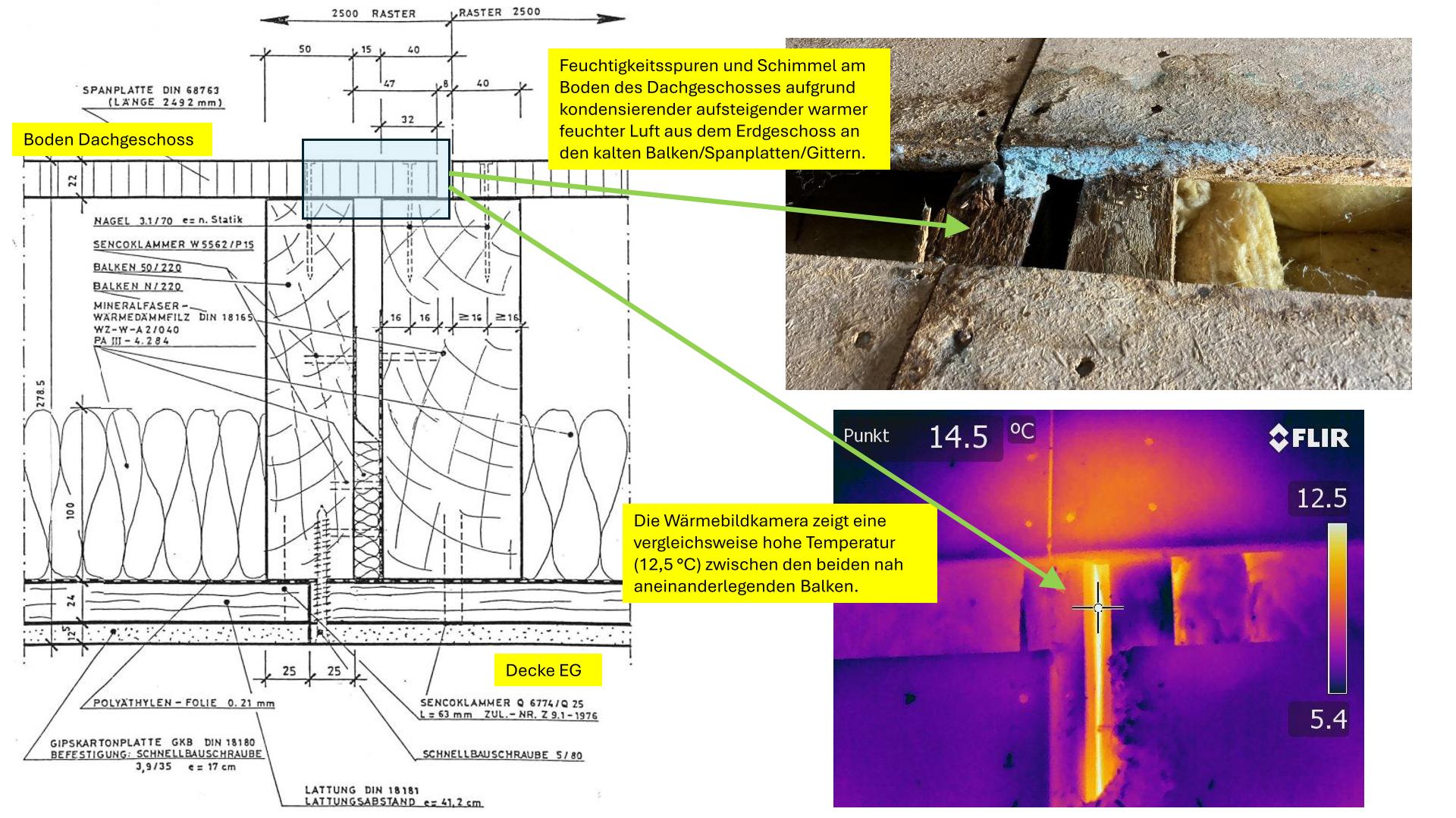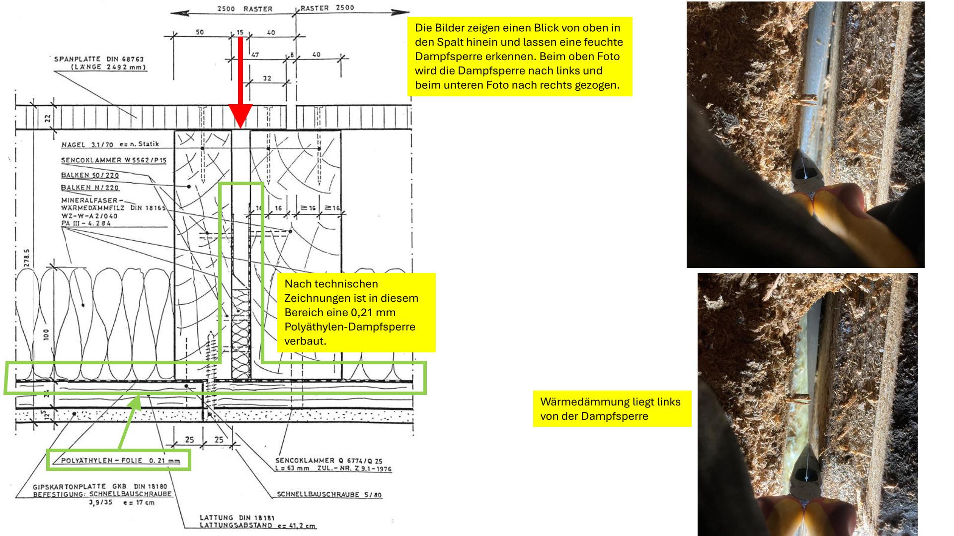schau mal hier: Feuchtigkeitsspuren am Boden eines kalten Dachbodens zwischen zwei Deckenelementen eines Fertighauses (Holzbalkendecke) mit hochgeführter PE-Folie . Da wird jeder fündig!