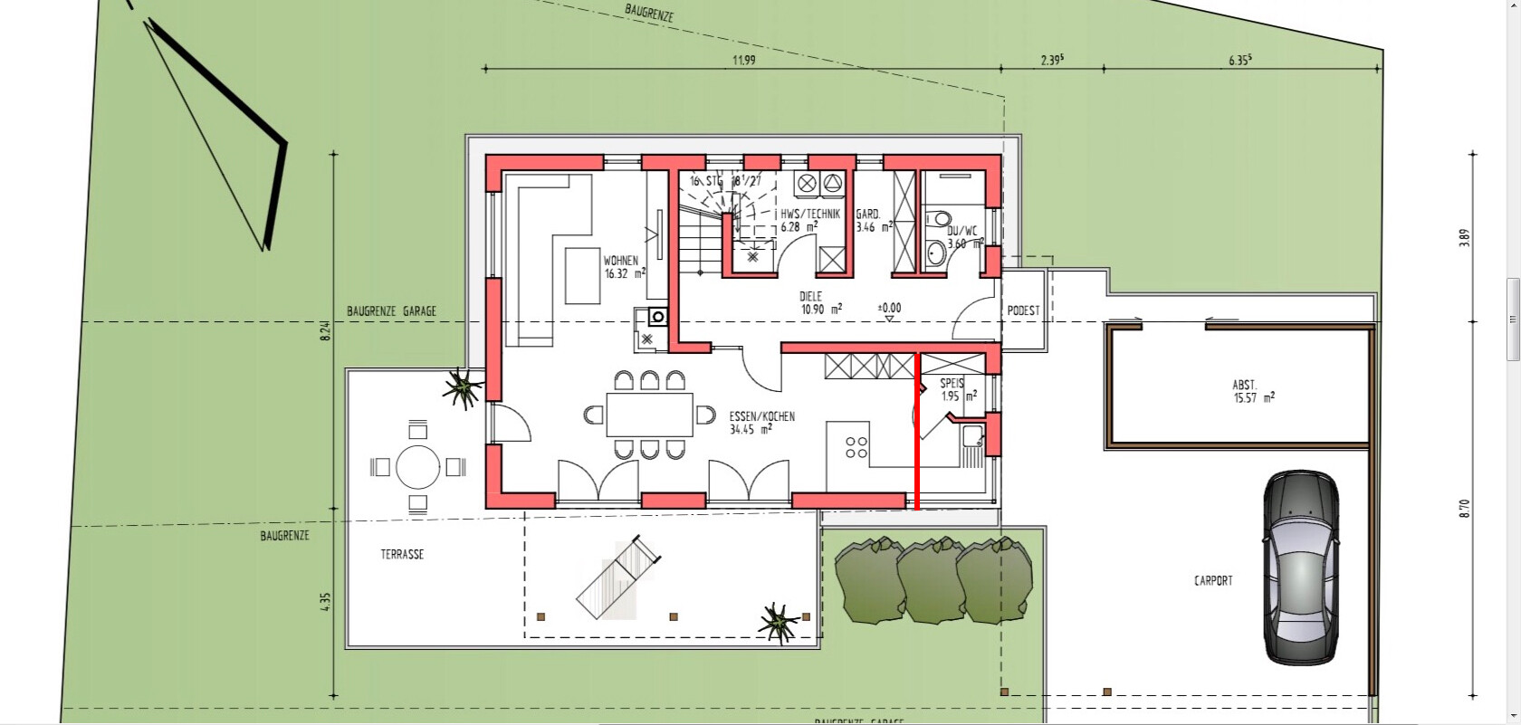 HansHaus schrieb:Wir standen vor einer ähnlichen Frage. Unser Grundstück ist leicht trapezförmig. Unser Grundstück ist das einzige Grundstück in der Reihe, welches nicht komplett rechteckig zur Straße ausgerichtet ist. Bei uns verläuft die Grundstücksgrenze im Norden etwas schräg, alle anderen Seiten sind parallel zu den übrigen Grundstücken und zur Straße ausgerichtet. Wir wollten aber die Garage im Norden auf die Grundstücksgrenze stellen. Wir hatten also zwei Möglichkeiten: Garage und Haus parallel zur Straße ausrichten, was bedeuten würde, dass zwischen Garage und Grundstücksgrenze eine kleine, schräg zulaufende Fläche übrig bleibt (die vermutlich mal als Schmutzecke enden würde, ungepflegt, schwer dort Rasen zu mähen usw...). Oder die Garage auf die Nordgrenze stellen und dementsprechend Haus und Garage NICHT parallel zur Straße auszurichten. Wir haben uns für Letzteres entschieden und werden unser Haus demnach nicht parallel zur Straße setzen. Alle anderen Häuser in der Reihe werden aber parallel zur Straße liegen. Und weißt du was? Es stört uns nicht . Im Gegenteil, ich finde das sogar gut. Denn so haben wir im hinteren Hausbereich auch noch etwas mehr Abstand zum Nachbarn als bei paralleler Ausrichtung (recht enge Bebauung). Außerdem entfällt die unschöne Dreck-Ecke, die ansonsten zwischen Nord-Grenze und Garage entstanden wäre. Überlegt euch gut, was für EUCH das Richtige ist. Ob das Haus am Ende parallel zur Straße steht oder nicht ist doch eigentlich nicht wichtig, wenn es anders besser passt (es sei denn, es wäre im Bebauungsplan vorgegeben). Für mich war der Gedanke am Anfang auch komisch, dass unser Haus in der Reihe das Einzige sein wird, was nicht parallel zur Straße ausgerichtet ist. Aber desto mehr ich darüber nachdachte, desto mehr Gefallen fand ich an dem Gedanken. Also überlegt es euch.
