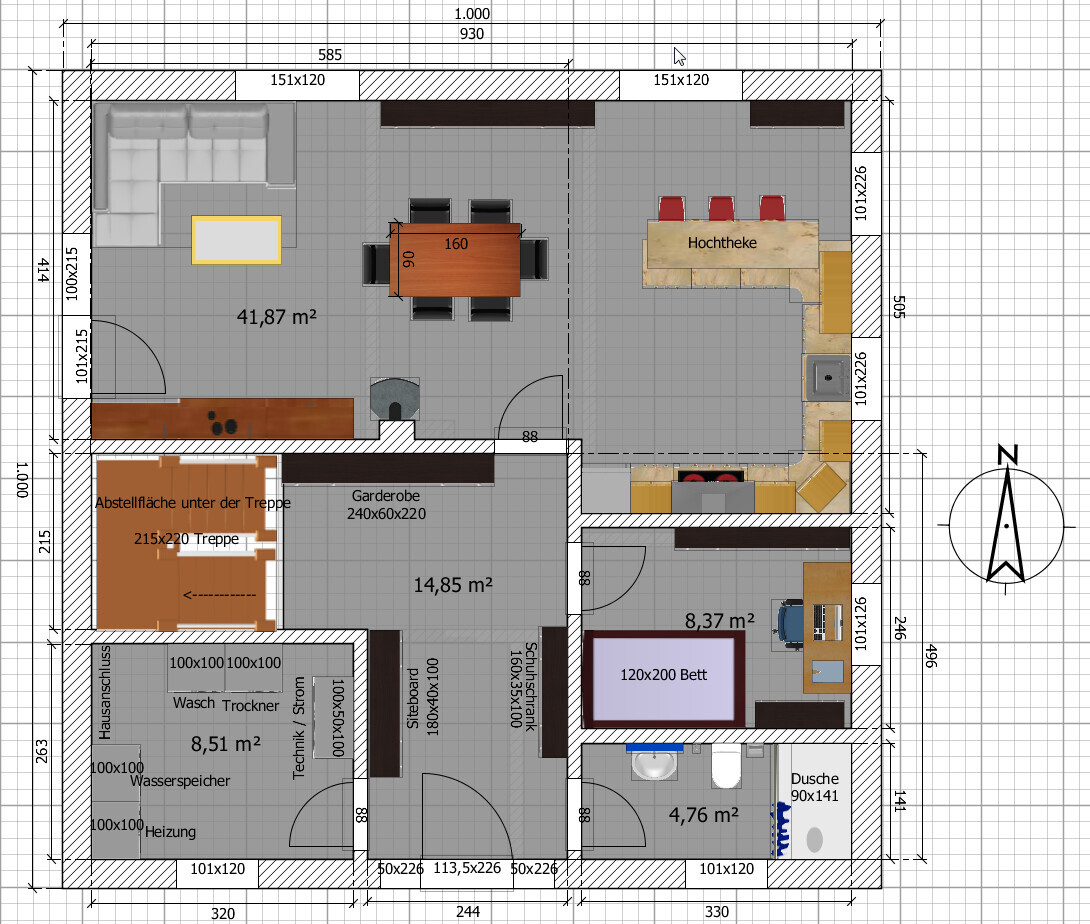 Eure Fenster finde ich insgesamt auch viel zu klein, in der Küche ist es nur ein kleines 1x1,2m Fenster, im Wohnzimmer auf der langen Seite auch keine bodentiefen Fenster. Kind 1 hat mit dem kleinen Fenster und der Nordausrichtung nie viel Licht oder Sonne im Zimmer.