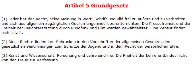 4.) Ich möchte an den Artikel § 5 des Grundgesetzes erinnern! Es ist davon auszugehen, dass Sie den Passus nicht auswendig kennen, deswegen habe ich mir die Mühe gemacht den Volltext des Grundgesetztes hier reinzustellen.