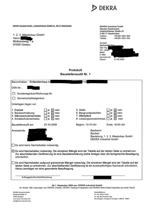 Stimmt ist mir noch gar nicht aufgefallen. Die Prüfung war aber am 23.10. Das war 3 tage vor unserem Einzug. Es wurde alles Mögliche begutachtet. Der Gutachter ist ein freier Architekt aus der Nähe (wurde aber über 123 beauftragt)