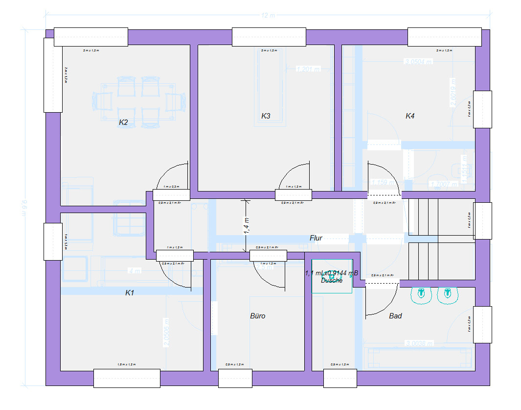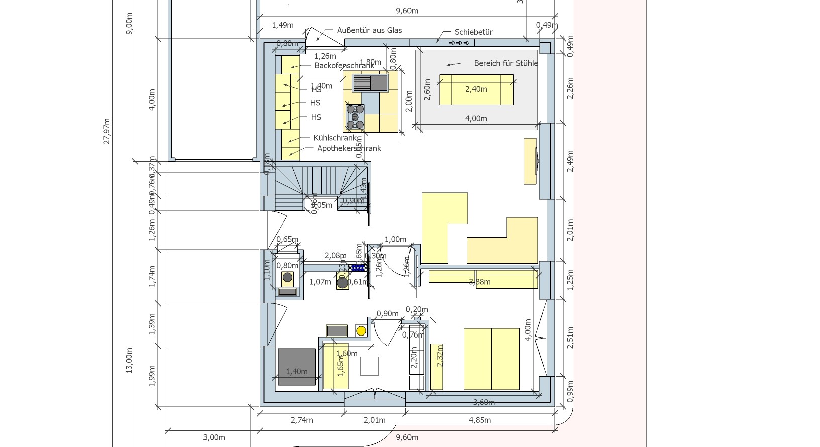 Hab grad noch mal die Küche mit Kochinsel versehen und die Sofas umgestellt. Letztere könnte man auch prima nebeneinanderstellen wenn man mal nen Kinoabend macht.Also die Kochinsel find ich überdimensioniert und das Umstellen der Sofas hat's jetzt nicht herausgerissen, wenn Du mich fragst.Hier noch eine Variante, wobei ich Deinen Eingang von der Straße noch mal aufgegriffen habe. Ziel war ein Gäste-WC, sowie Schlafzimmer nicht direkt an Straße.
