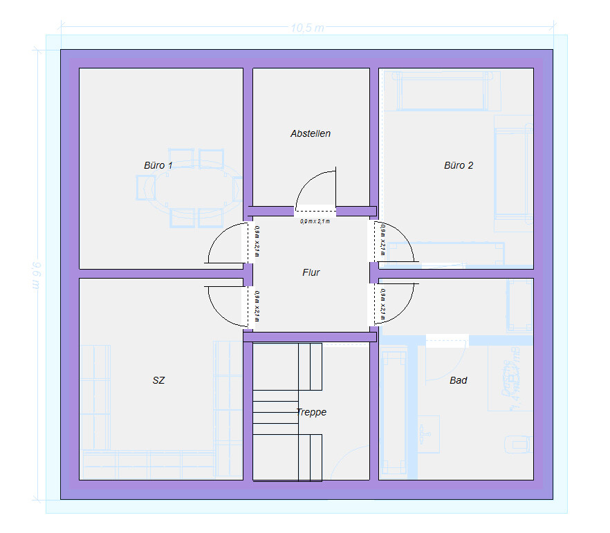 Ausgebautes DG wäre natürlich die Lösung aller Platzprobleme. Nur mal angedeutet mit 9,6x10,5. Wer sich da rein kniet, kann die Grundfläche bestimmt noch stärker minimieren, ohne Verlust an Lebensqualität: