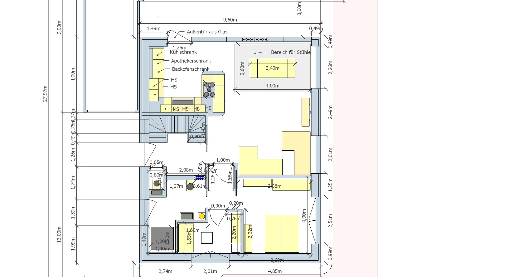 so wie ihr euer Wohnzimmer geplant habt, wird das aber keine "Entspannungszone". Ihr habt vier Kinder die momentan noch klein sind und bestimmt nicht abends allein zum Kühlschrank laufen. Wenn die Kinder älter werden, dann wird ständig abends eines der Kinder (im Laufe des Abends bestimmt jedes Kind dreimal) in die Küche kommen und durch euren Wohnbereich laufen... Licht an, Türe wird offengelassen usw., auf dem Sofa etwas dösen könnt ihr dann vergessen. Ich würde meinen Wohnbereich wenigstens so planen, dass ich dort auch ein wenig Ruhe am Abend habe und nicht gerade einen Durchgangsraum plane, durch den Abends dann auch noch die Freunde meiner Kinder zur Küche laufen. Wie wollt ihr eigentlich fernsehen, stehend vor dem Fernseher?