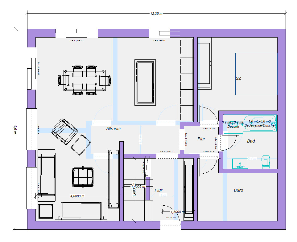 Mal ein Entwurf. Ich schaffe allerdings nicht die 12m, sondern lande bei 12,35m. Grund ist vor allem die Garderobe - ich habe da einen 3m langen Schrank mit 45er Tiefe (so tief sind meine auch) reingezeichnet. Den braucht man bestimmt bei 6 Leuten.
