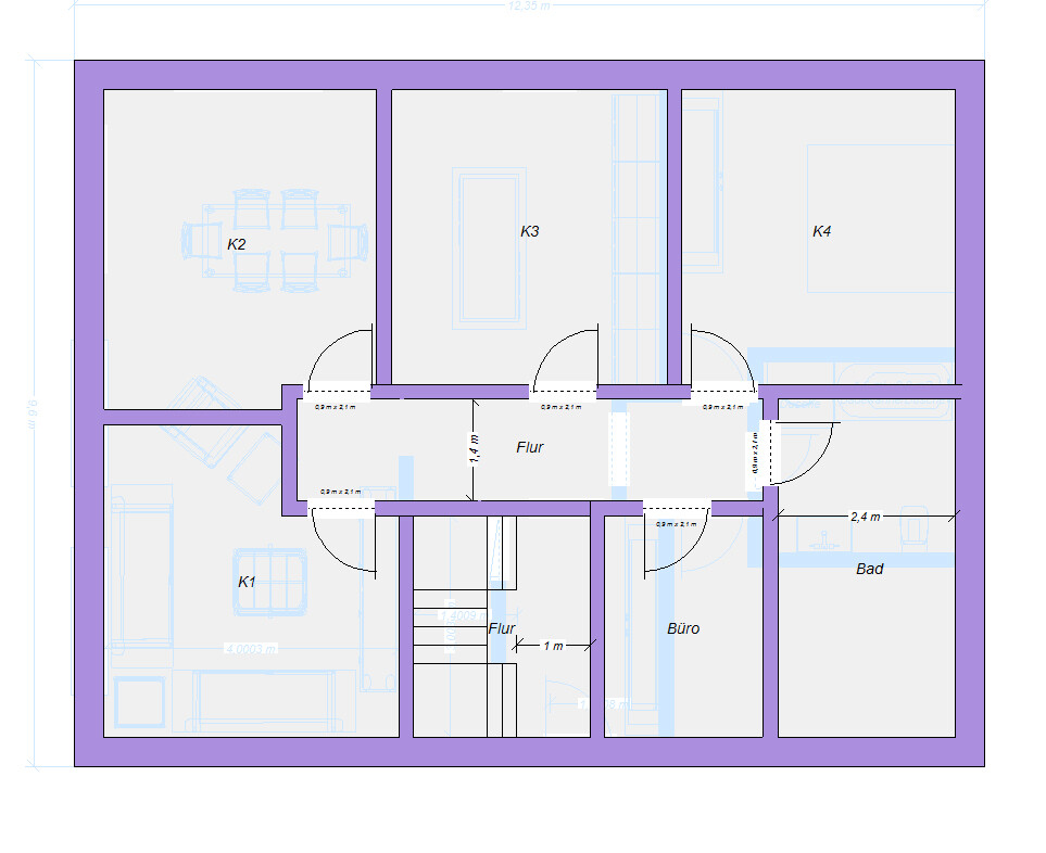 Ach so, Fenster hab ich aus Faulheit größtenteils weggelassen. Treppe wie immer kein Podest! (Programmproblem). Wasserentsorgung im Bad auch noch nicht klar. Vielleicht tauscht man Büro und Bad und entsorgt im Flur unten.